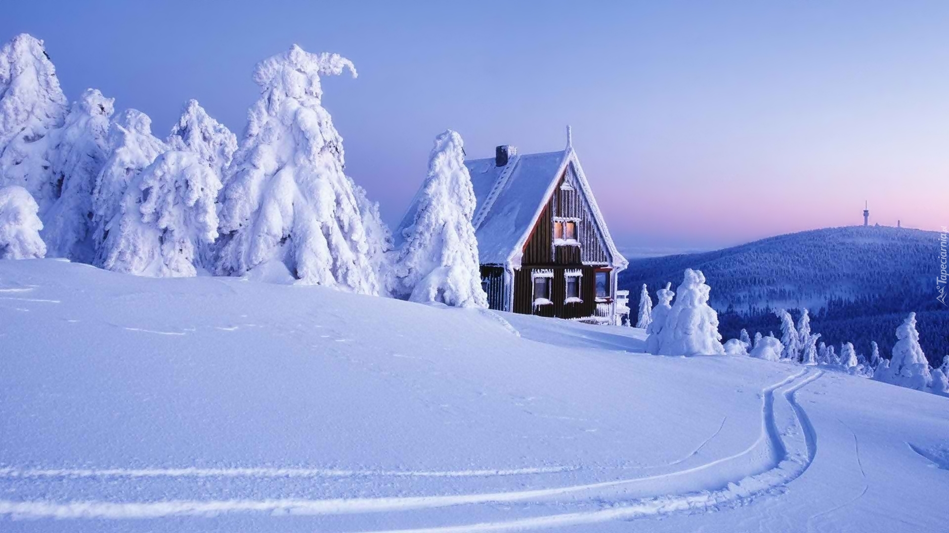 Edytor tapety: Zima, Domek, Ośnieżone, Drzewa