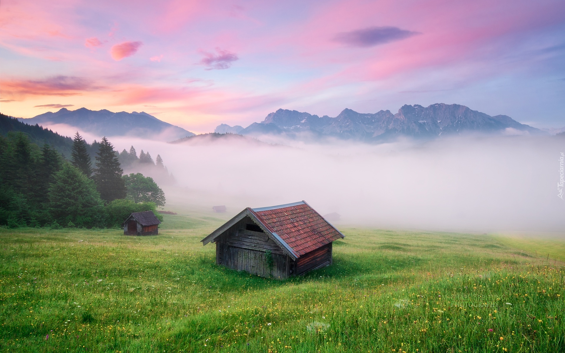 Edytor tapety: Góry, Lasy, Mgła, Domek