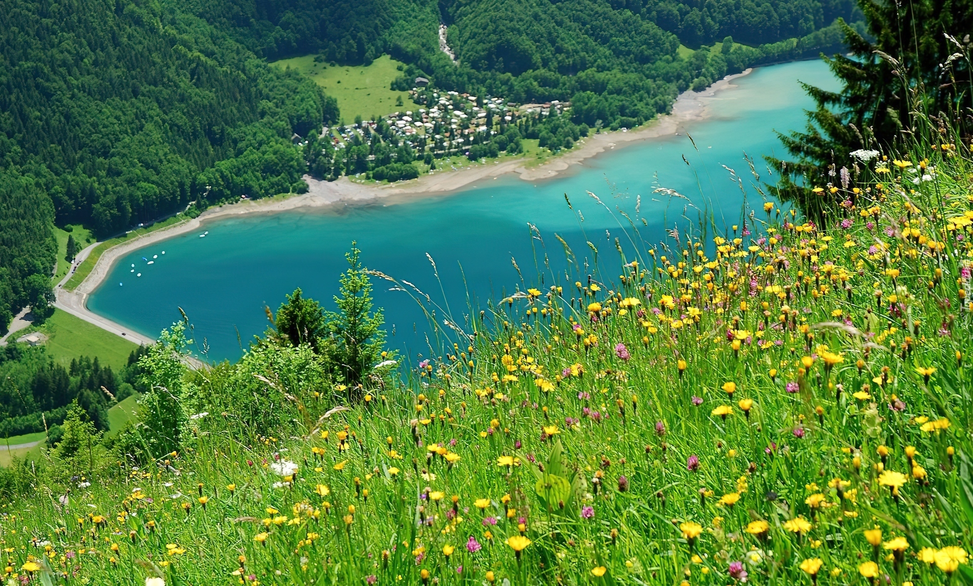 Edytor tapety: Łąka, Jezioro, Zalesione, Góry, Glarus, Szwajcaria