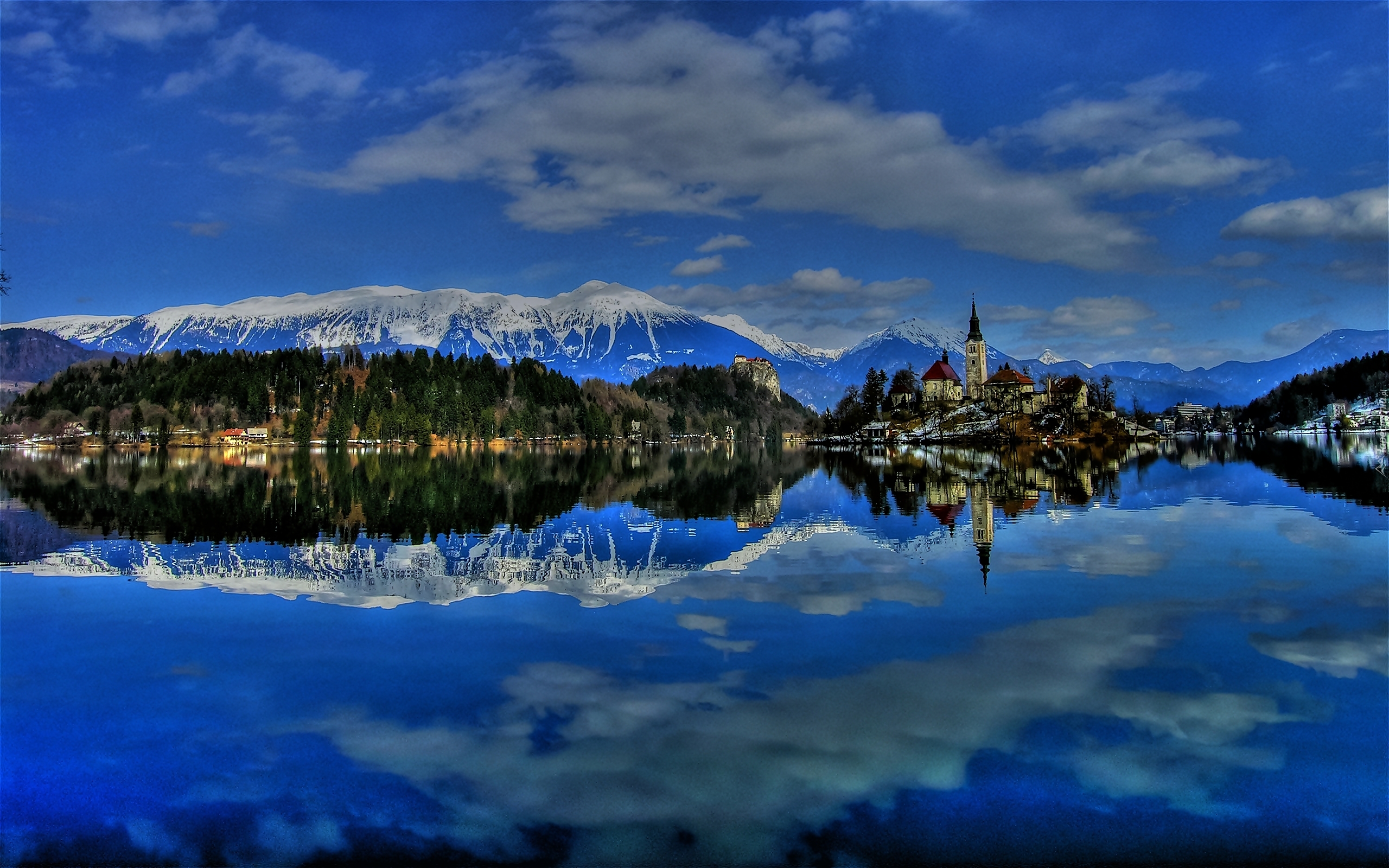 Edytor tapety: Góry, Jezioro, Kościół, Odbicie
