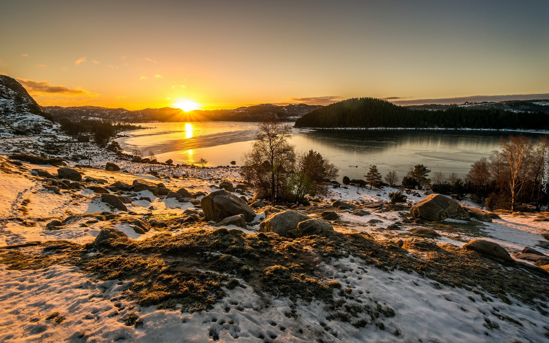 Edytor tapety: Rzeka, Zachodzące, Słońce, Zima