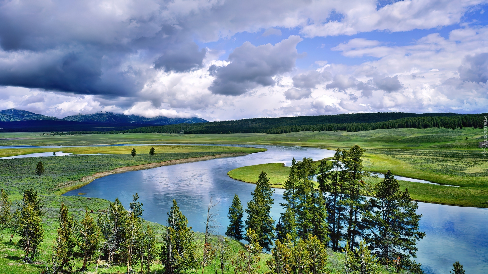 Edytor tapety: Rzeka, Las, Góry, Chmury