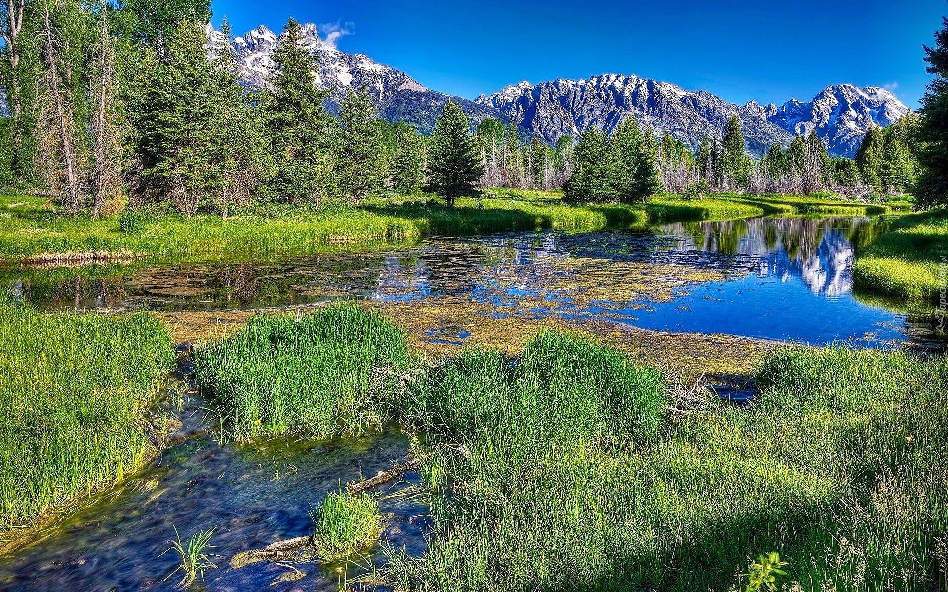 Edytor tapety: Rzeka, Zarośla, Las, Góry