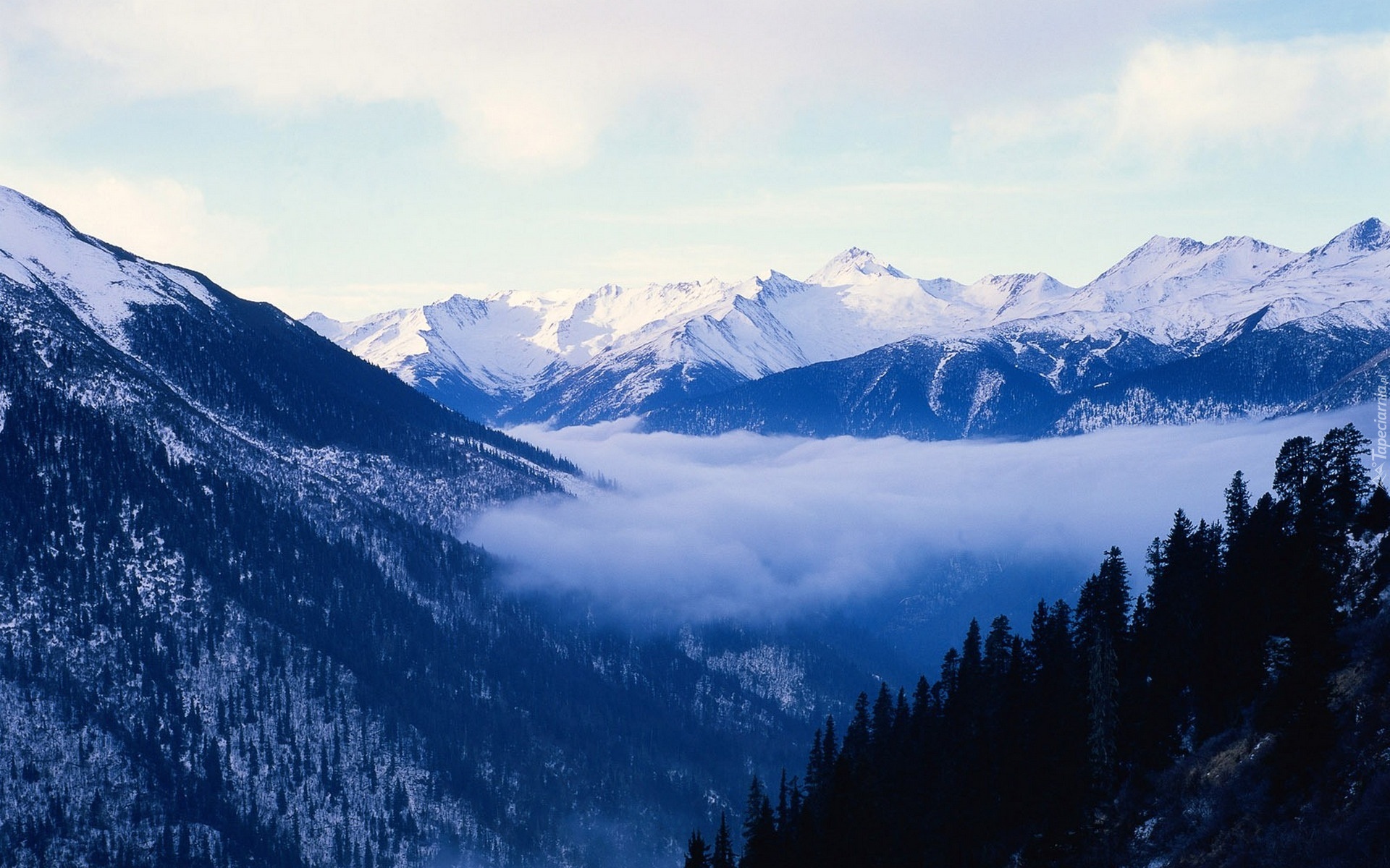Edytor tapety: Góry, Ośnieżone, Szczyty, Las, Mgła