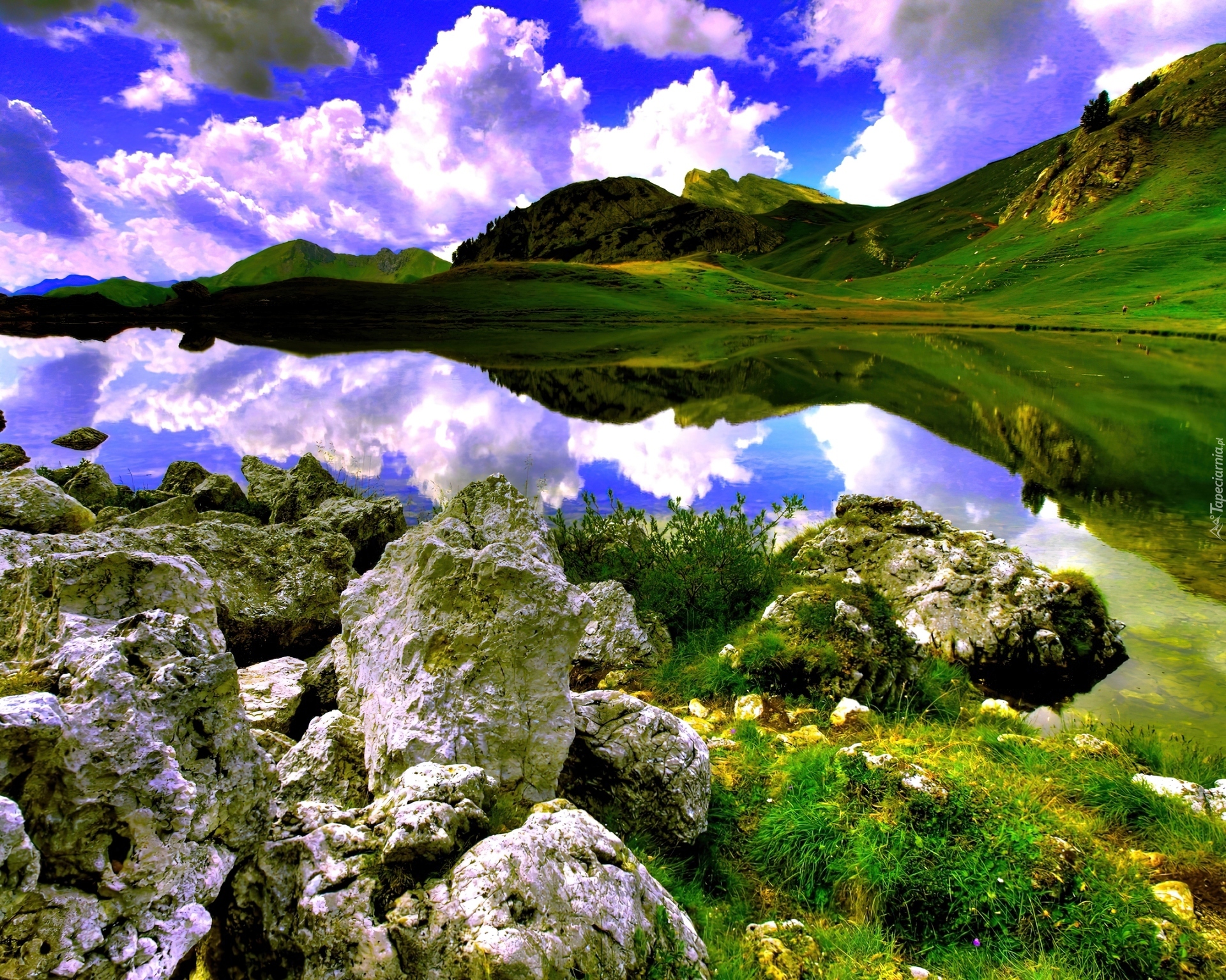 Edytor tapety: Góry, Jezioro, Kamienie, Odbicie, Lustrzane