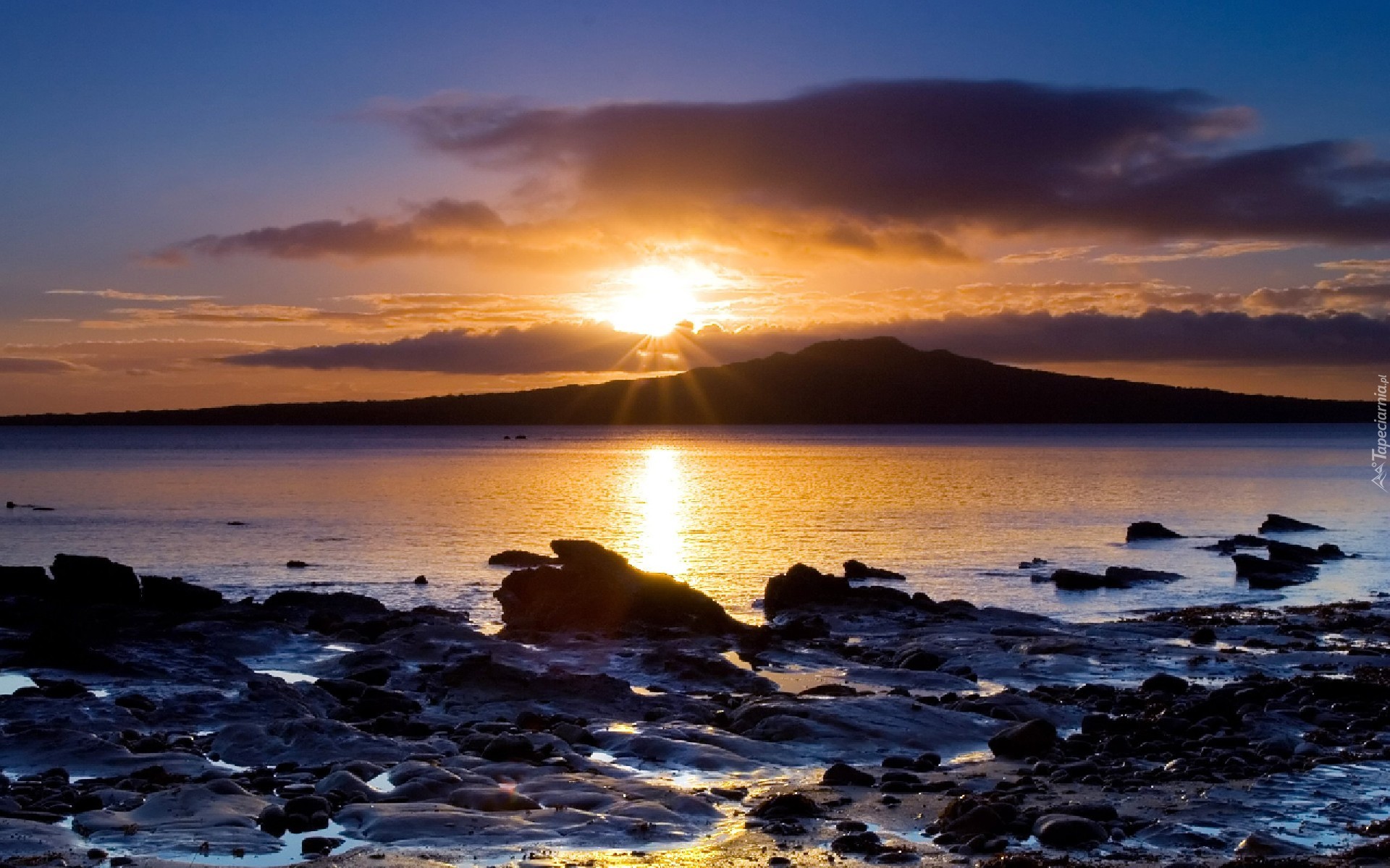 Edytor tapety: Zachód, Słońca, Jezioro, Kamienie