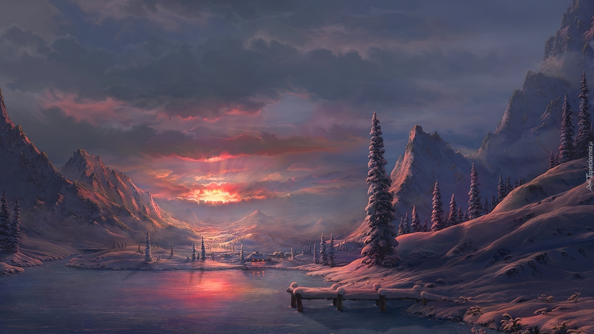 Edytor tapety: Góry, Jezioro, Zachód, Słońca, Drzewa