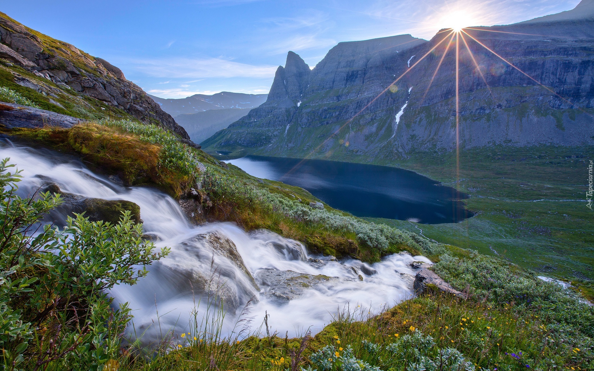 Edytor tapety: Góry, Wodospad, Promienie, Słońca