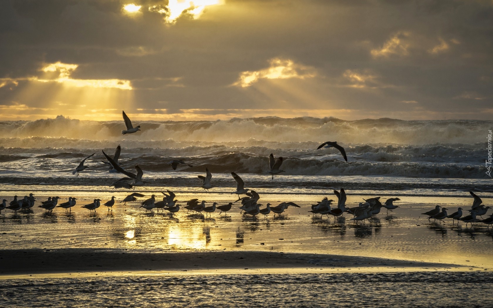 Edytor tapety: Zachód, Słońca, Promienie, Morze, Ptaki