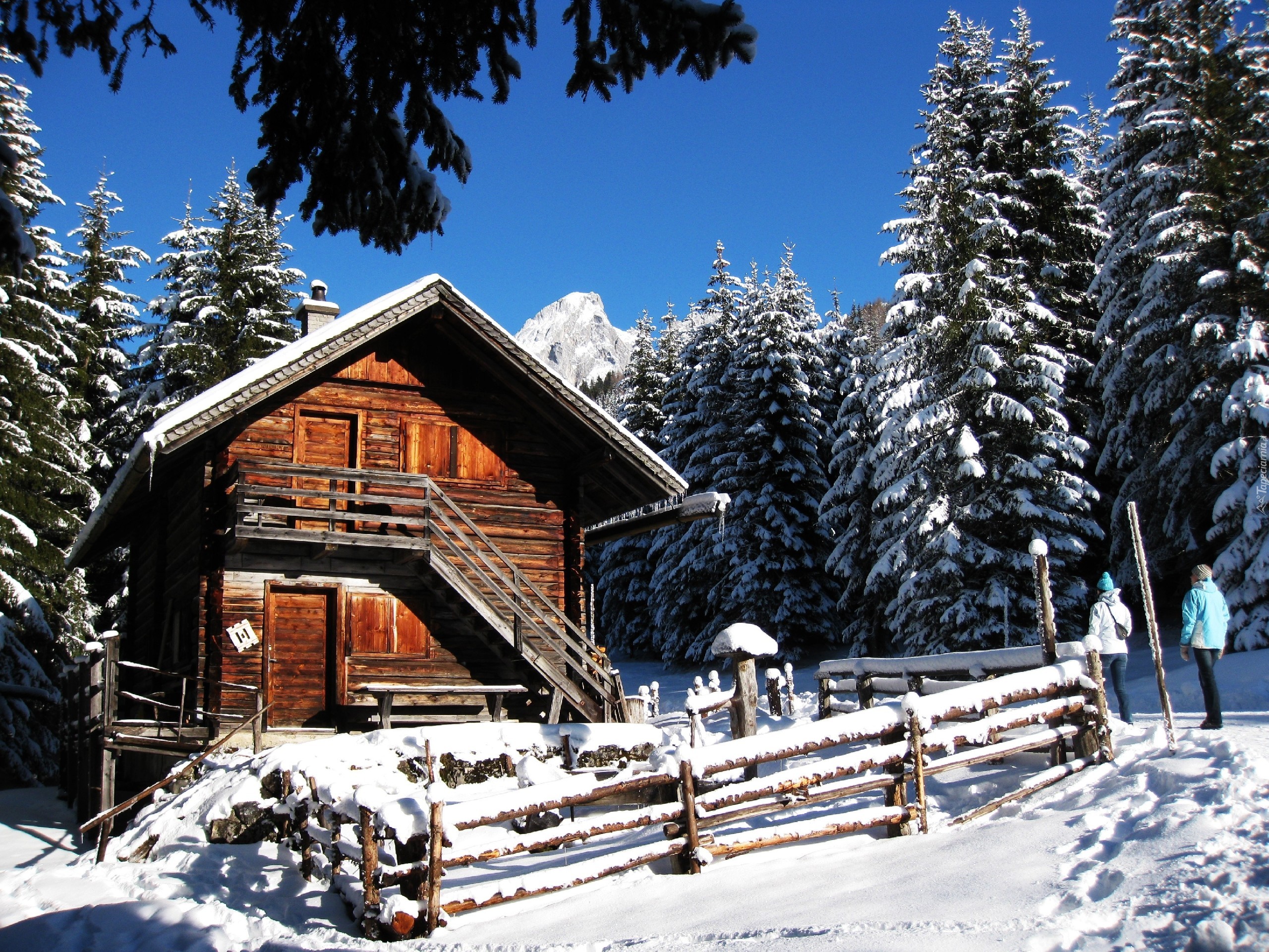 Edytor tapety: Zima, Drewniany, Dom, Ośnieżone, Iglaki