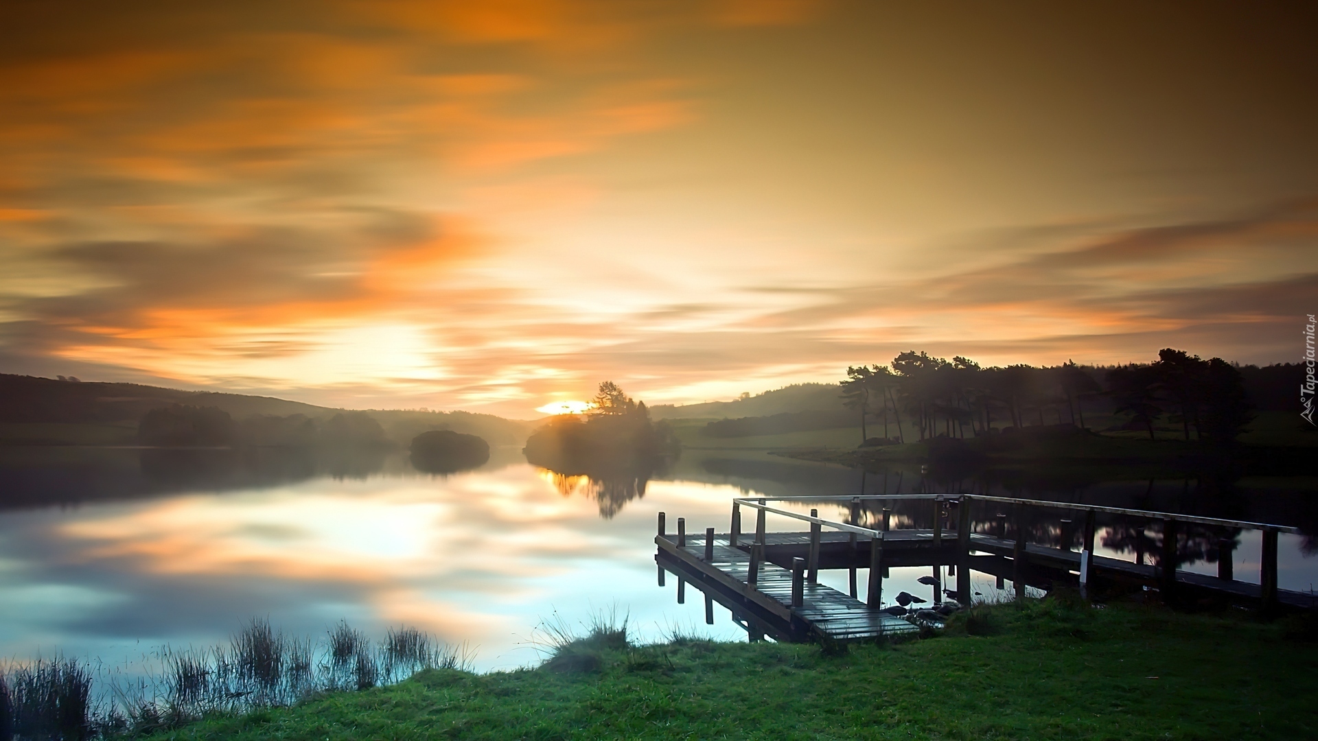 Edytor tapety: Jezioro, Pomost, Zachód, Słońca, Mgła