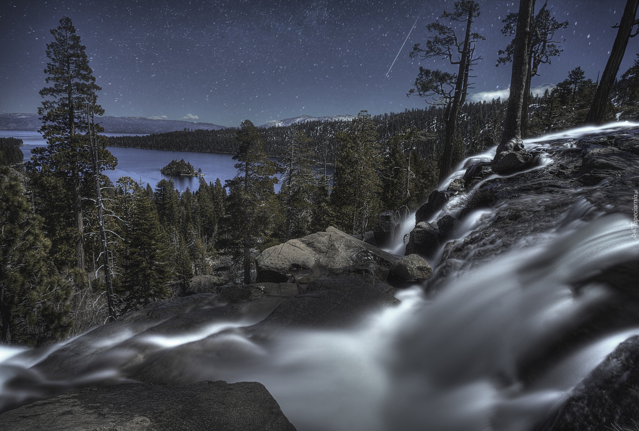 Edytor tapety: Wodospad, Las, Jezioro, Noc
