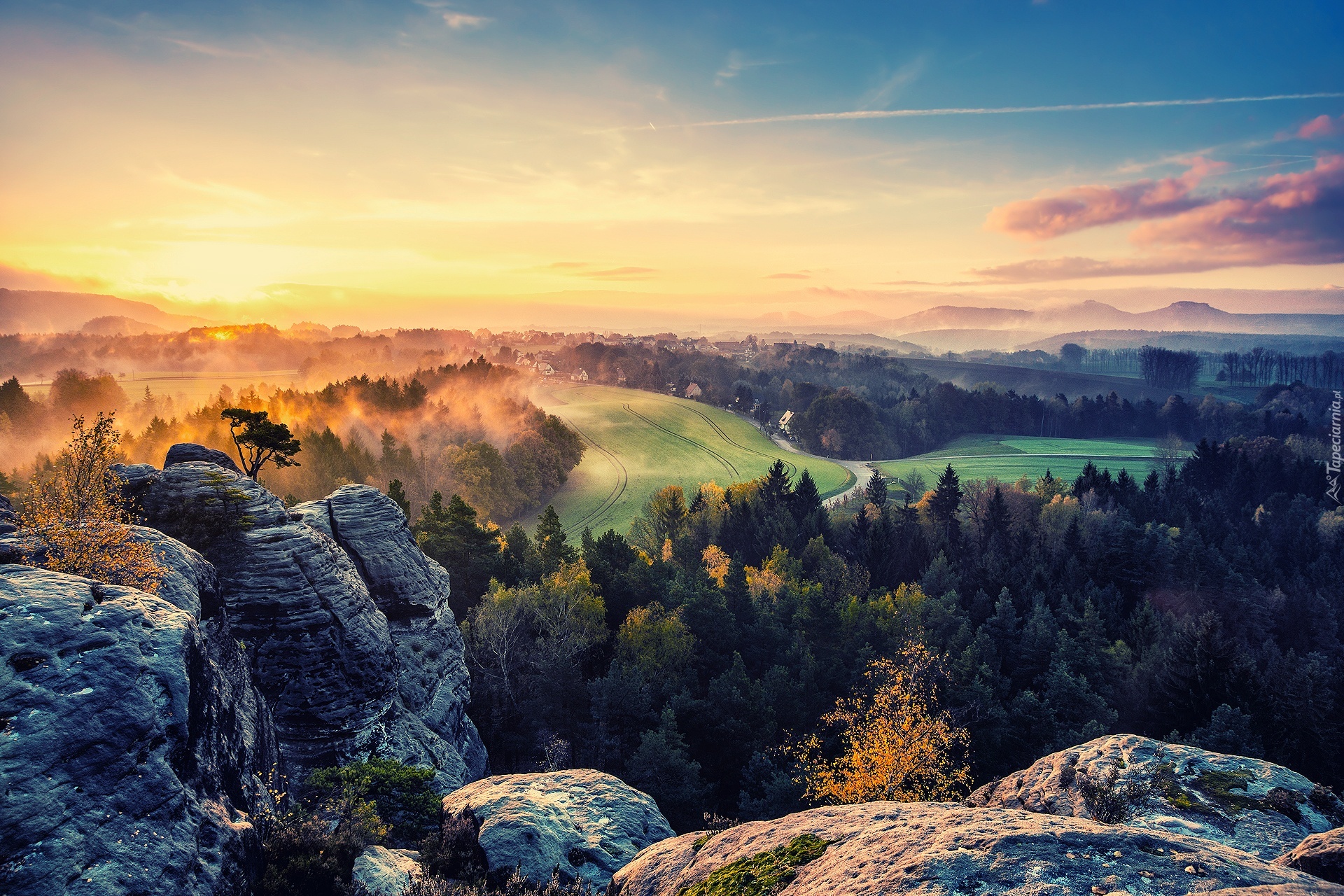Edytor tapety: Zachód, Słońca, Las, Pola