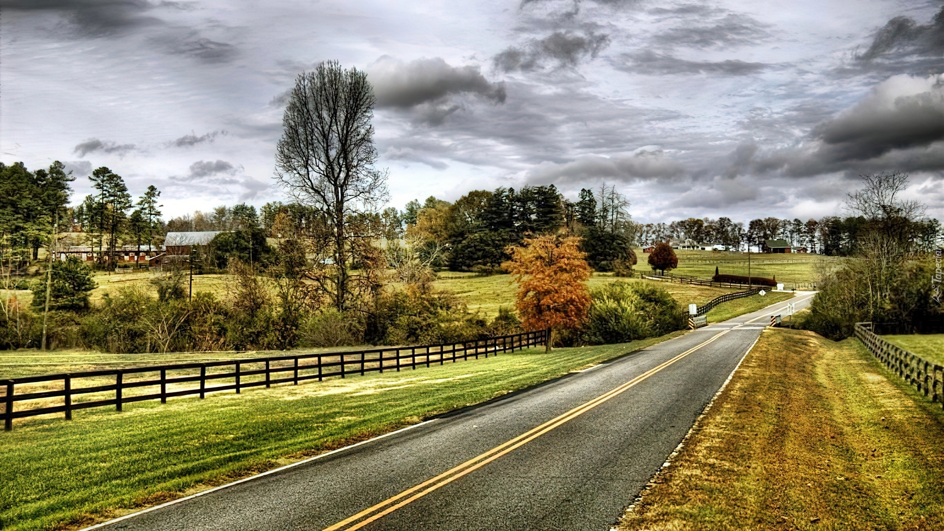 Edytor tapety: Droga, Przez, Wieś, Zachmurzone, Niebo