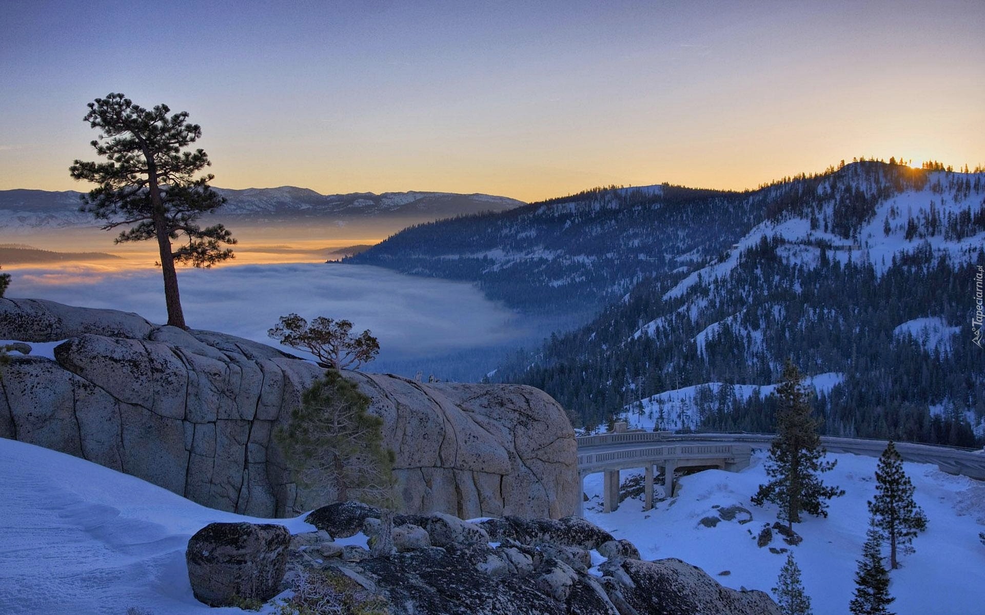 Edytor tapety: Zima, Skała, Zalesione, Góry, Mostek