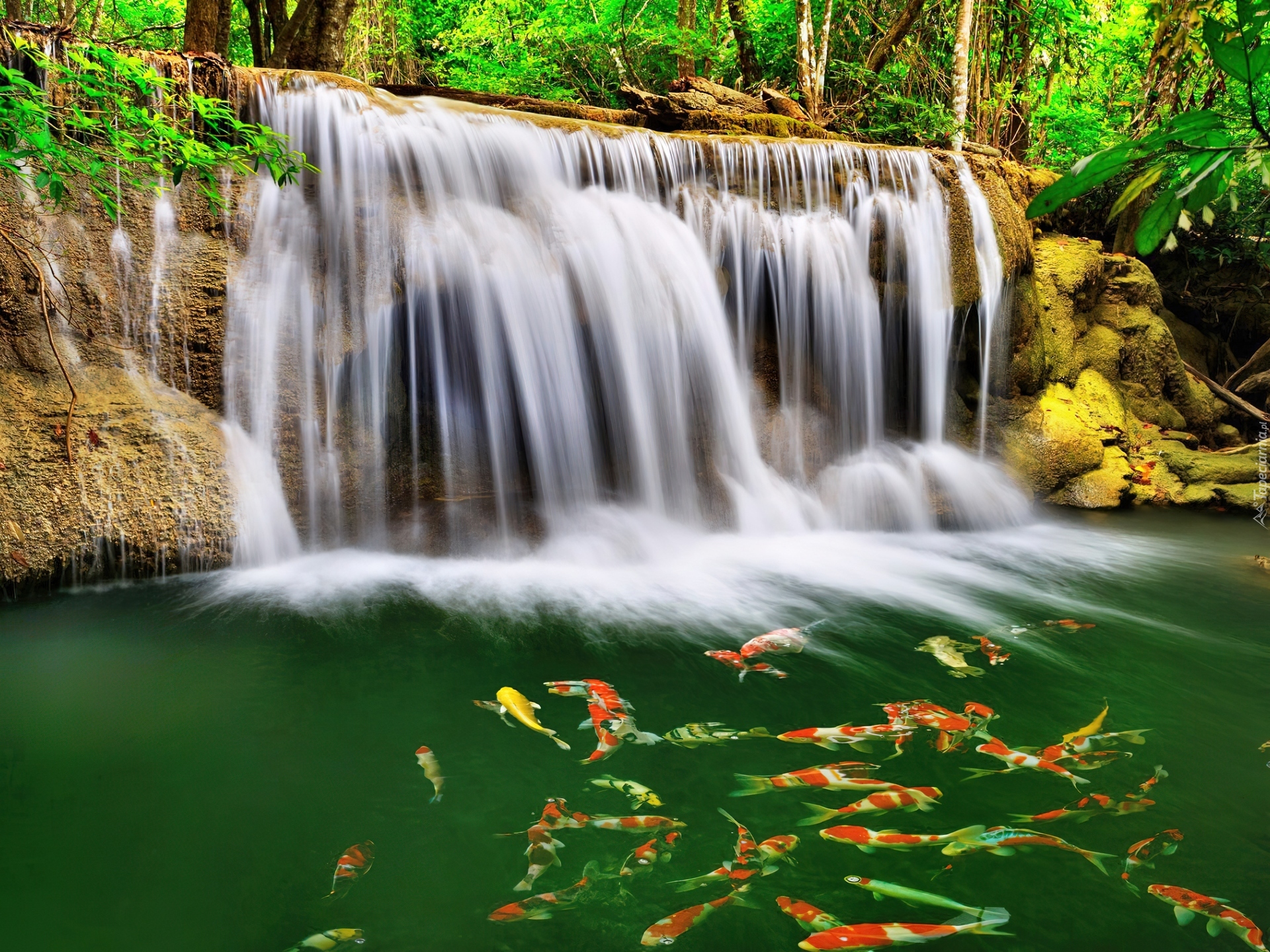 Edytor tapety: Wodospad, Kolorowe, Ryby