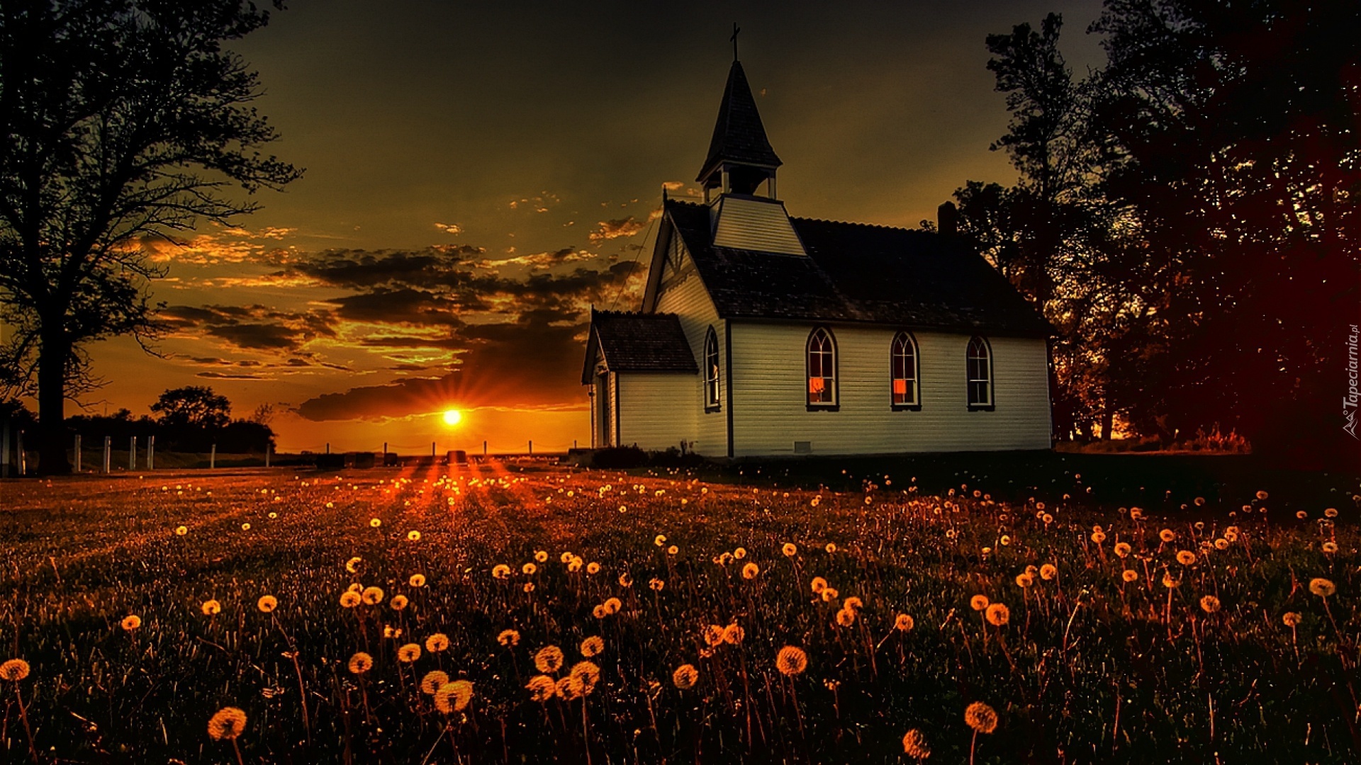 Edytor tapety: Łąka, Kościół, Zachód, Słońca