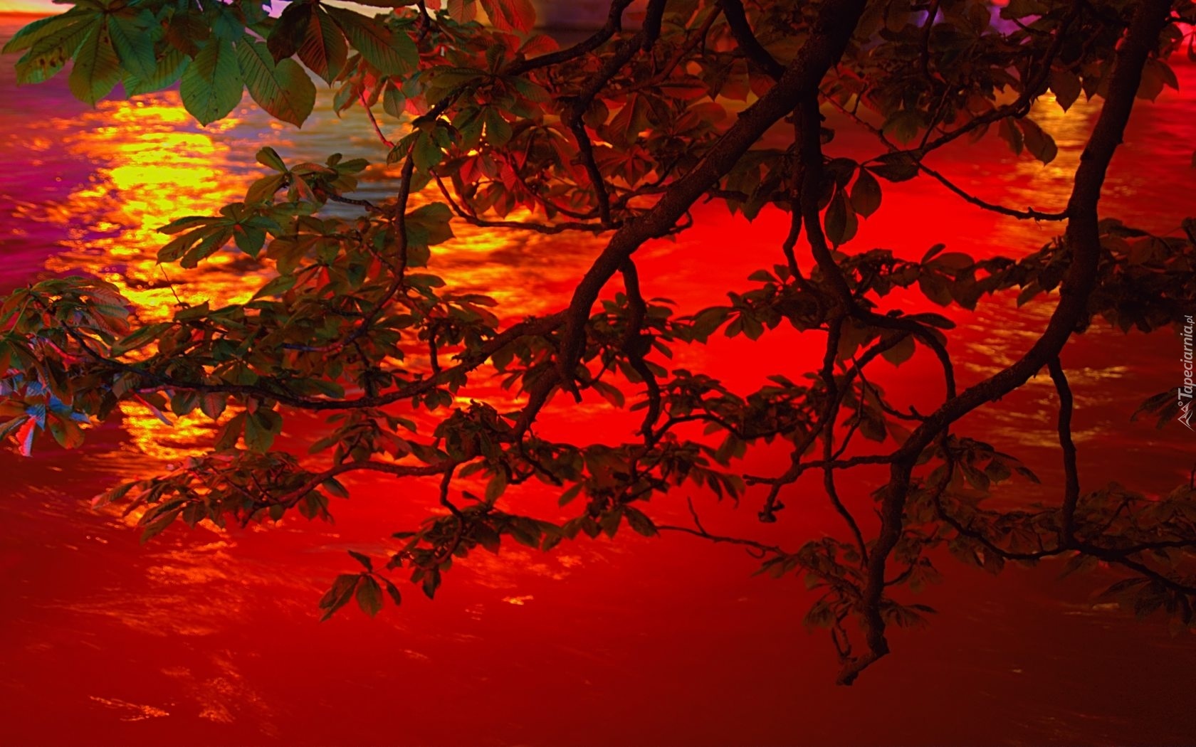 Edytor tapety: Jezioro, Zachód, Odbicie, Gałęzie, Drzewa