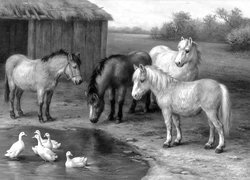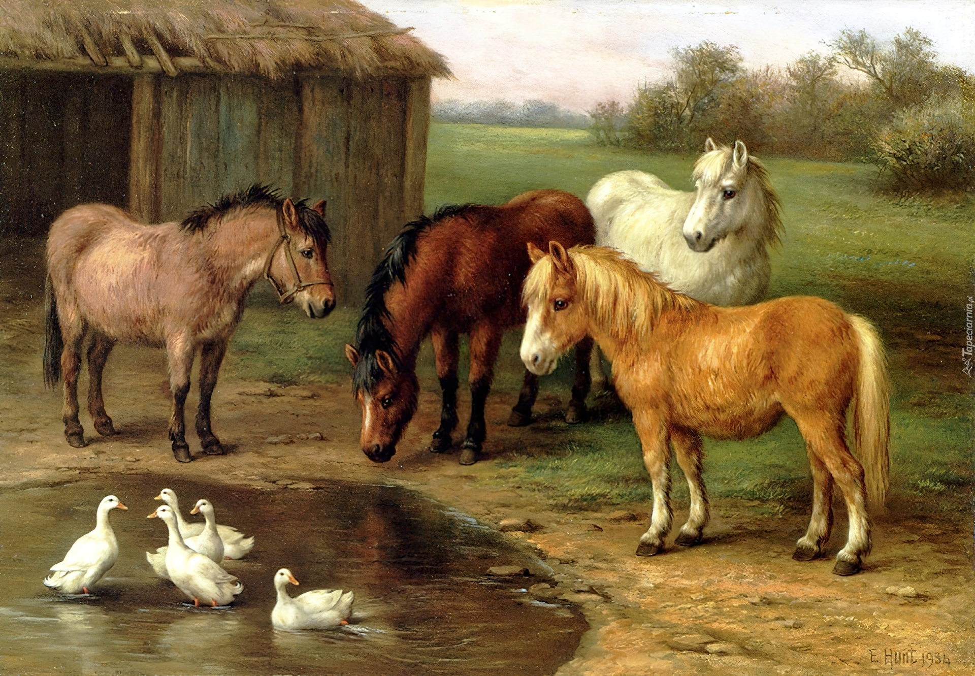 Edytor tapety: Edgar Hunt, Konie, Staw, Kaczki