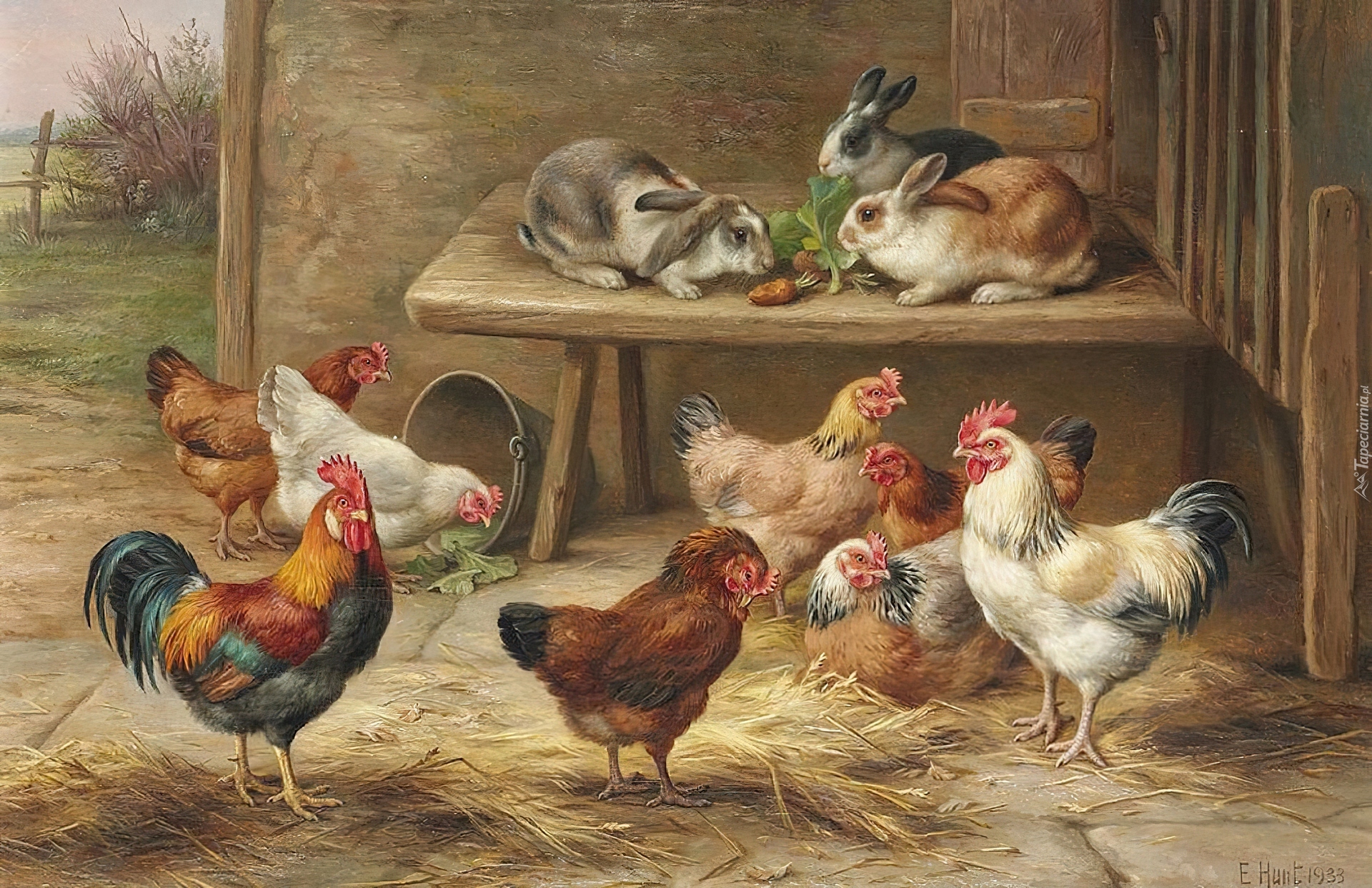 Edytor tapety: Edgar Hunt, Kury, Króliki, Stolik