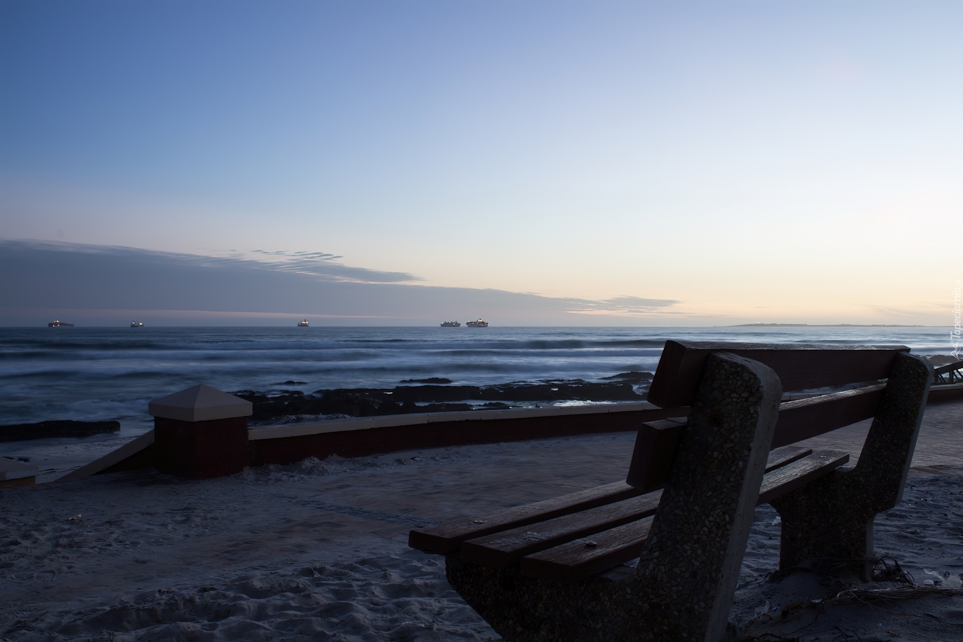 Edytor tapety: Morze, Ławeczka, Wieczór