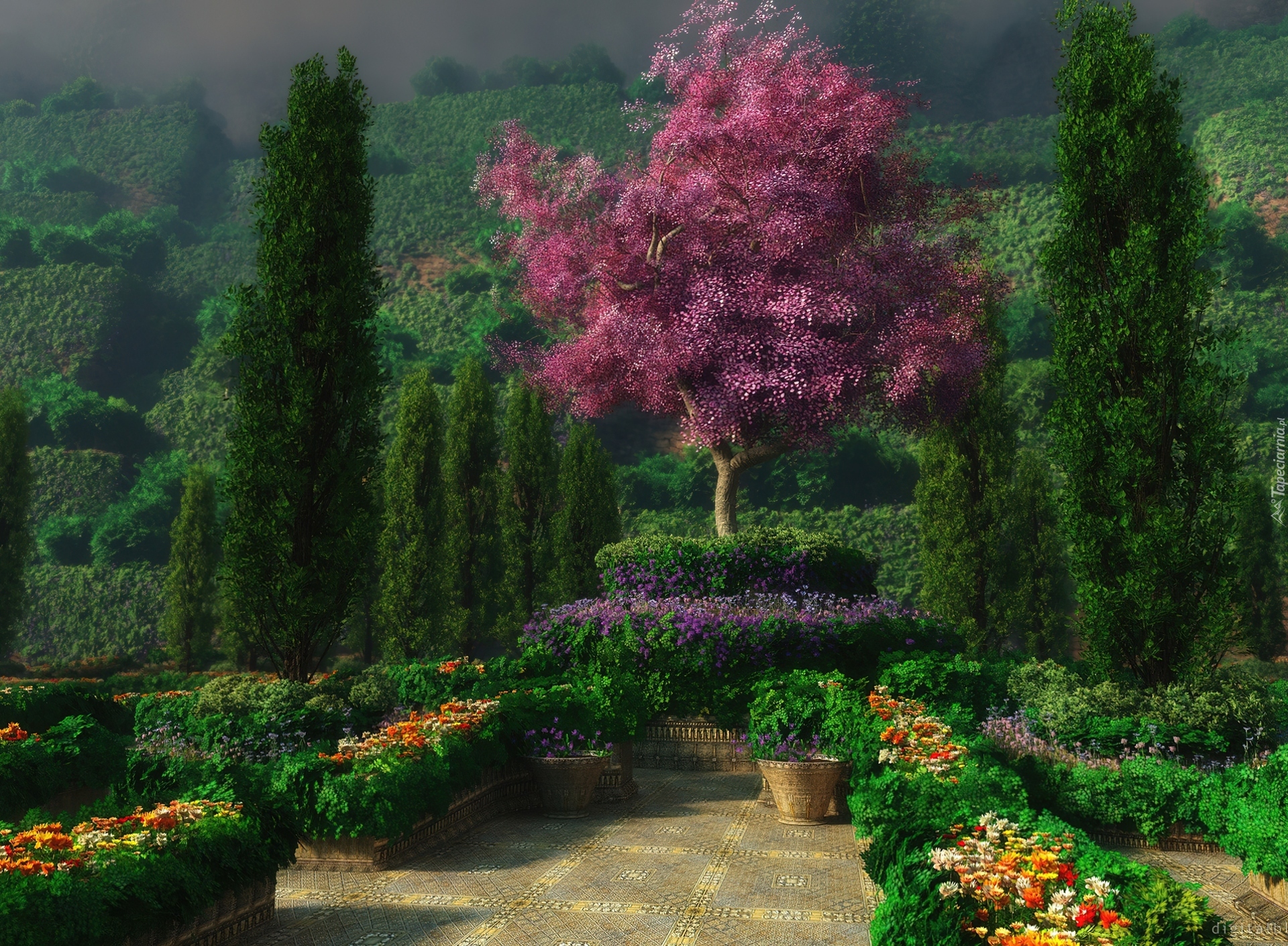 Edytor tapety: Ogród, Kwiaty, Bordowe, Drzewo