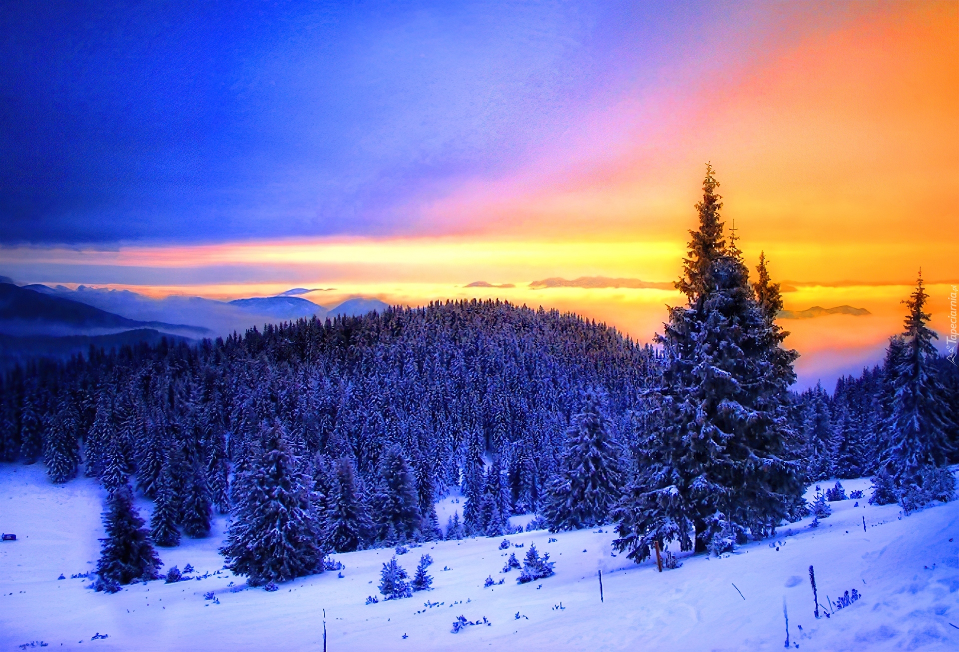 Edytor tapety: Zachód, Słońca, Las, Zima