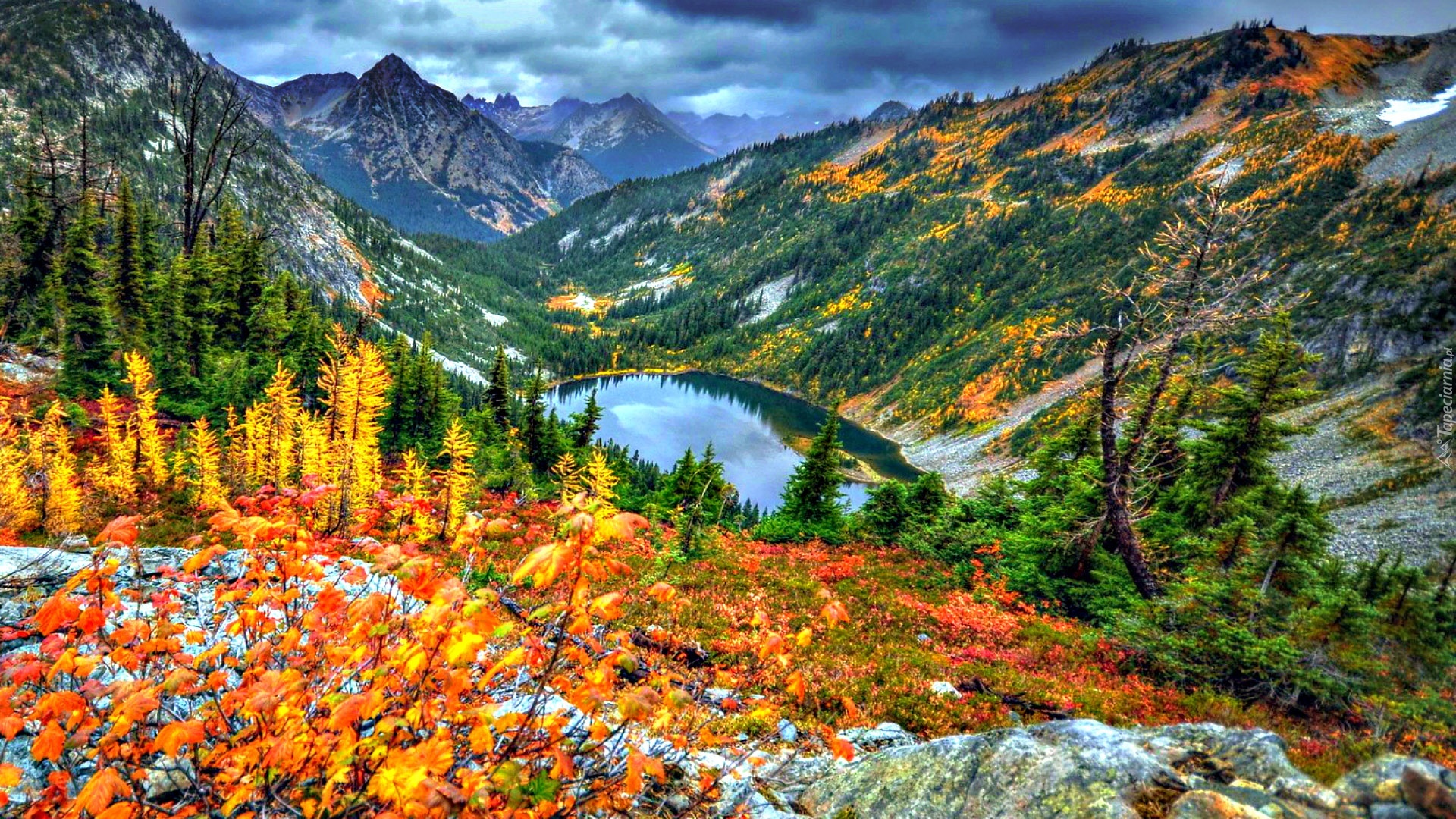 Edytor tapety: Góry, Jezioro, Drzewa, Chmury