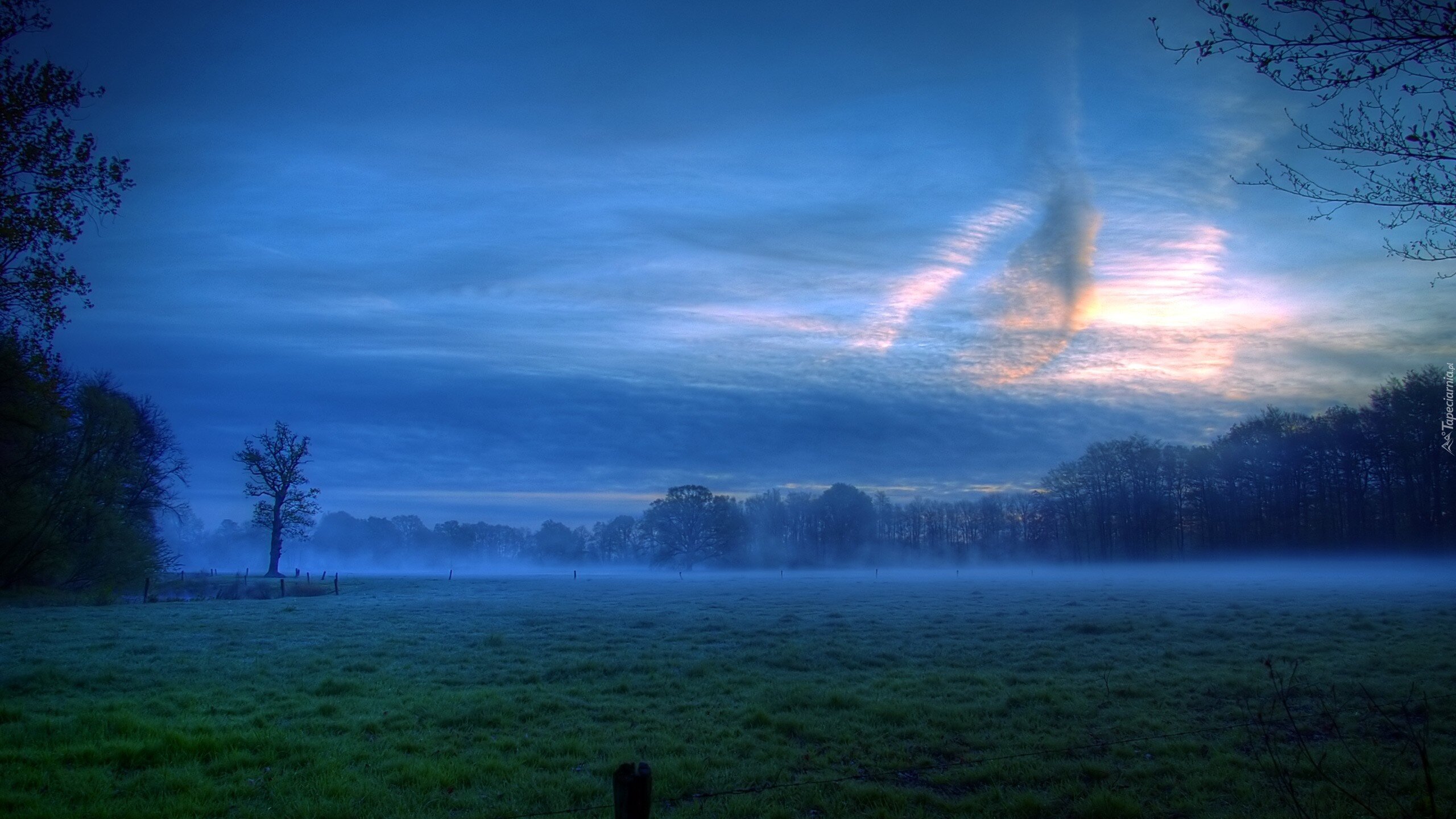 Edytor tapety: Łąka, Mgła, Poranek, Wschód, Słońca
