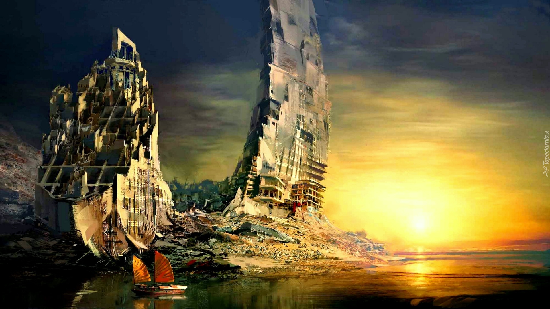 Edytor tapety: Jezioro, Zachód, Słońca, Ruiny