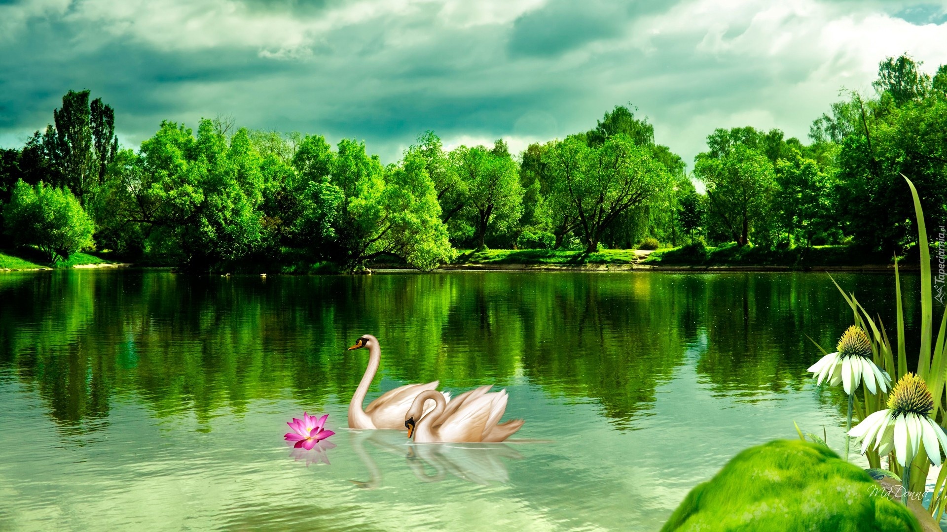 Edytor tapety: Jezioro, Łabędzie, Drzewa
