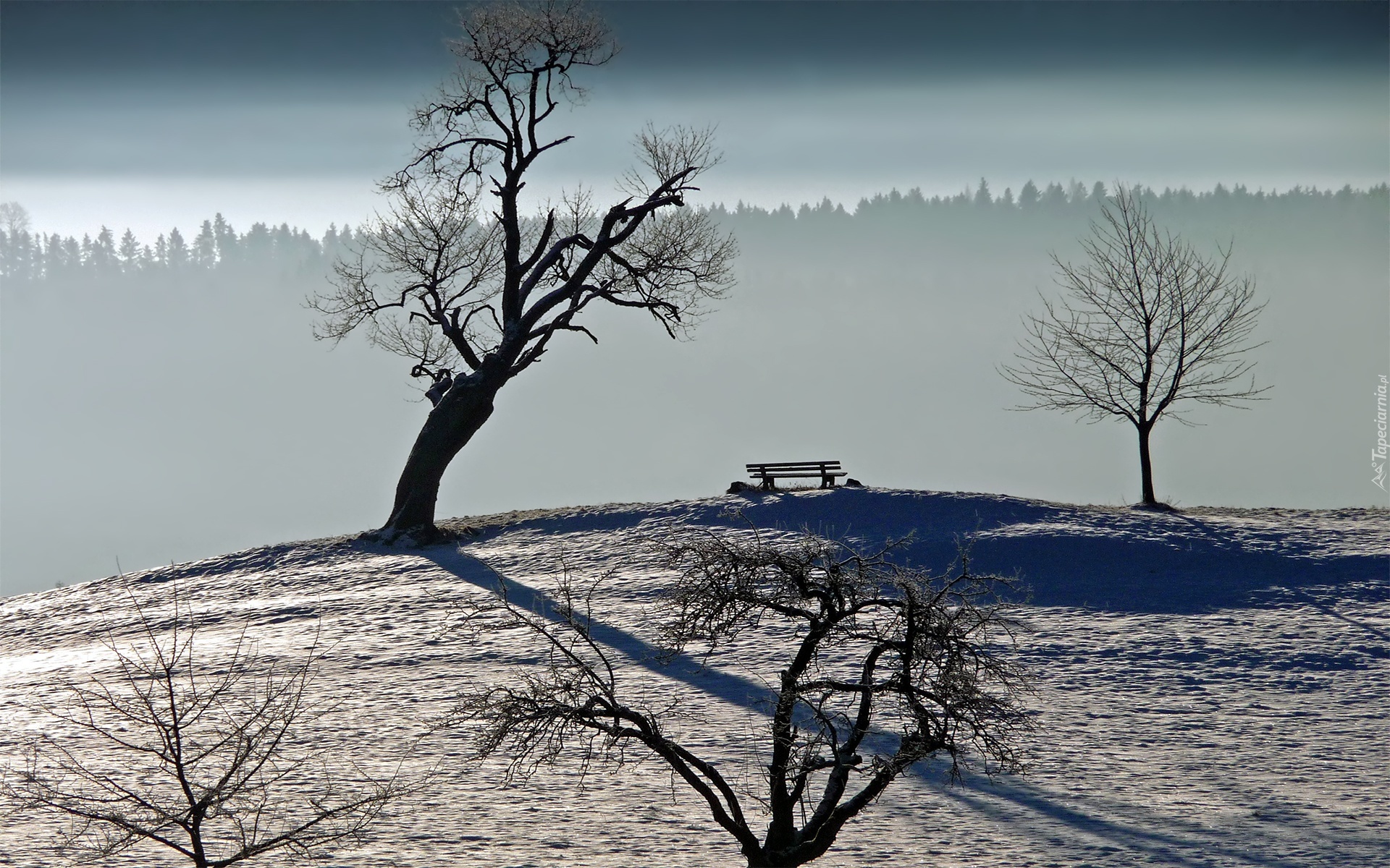 Edytor tapety: Suche, Drzewa, Śnieg, Ławeczka