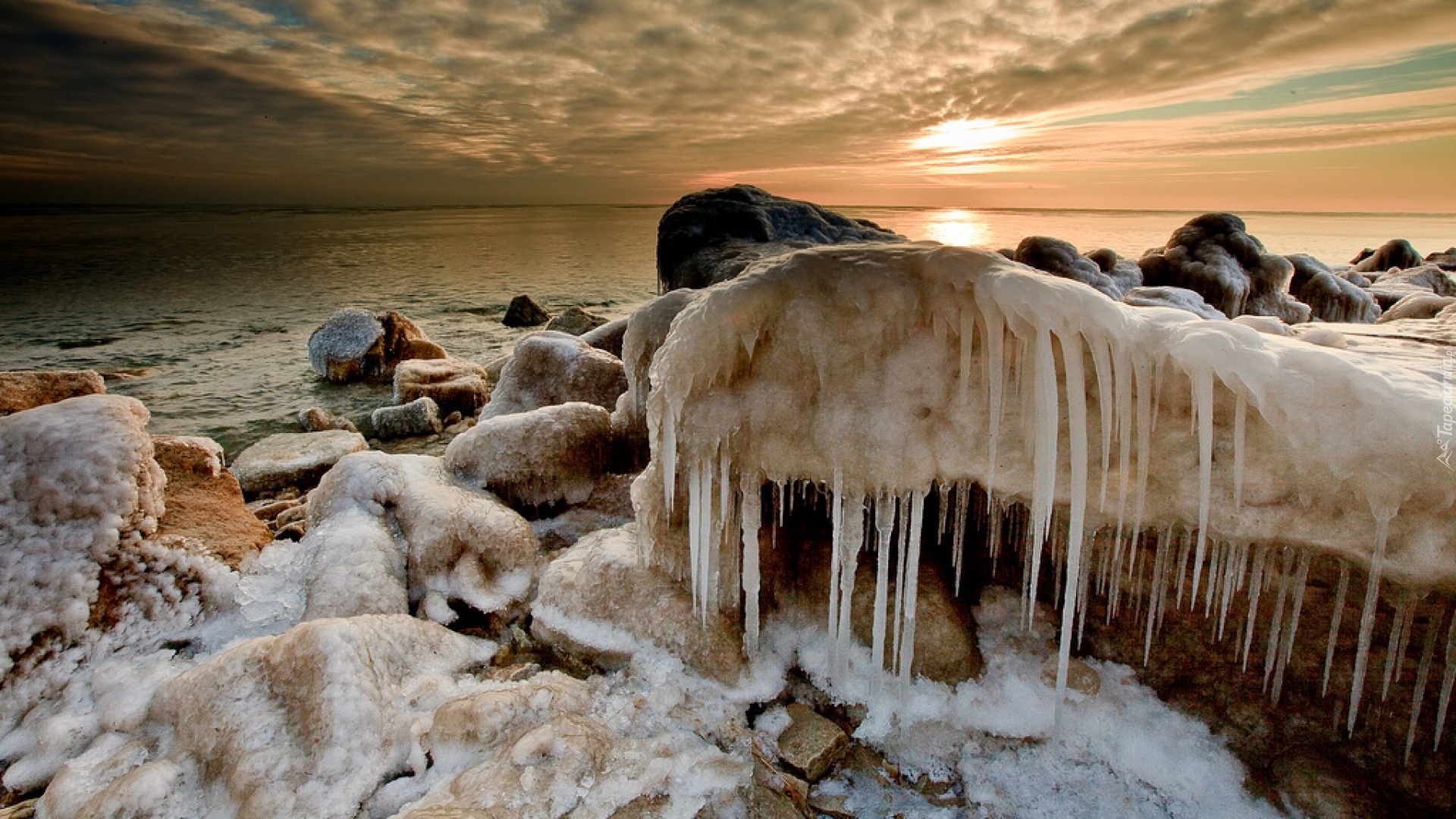 Edytor tapety: Morze, Plaża, Oblodzone, Kamienie, Zima