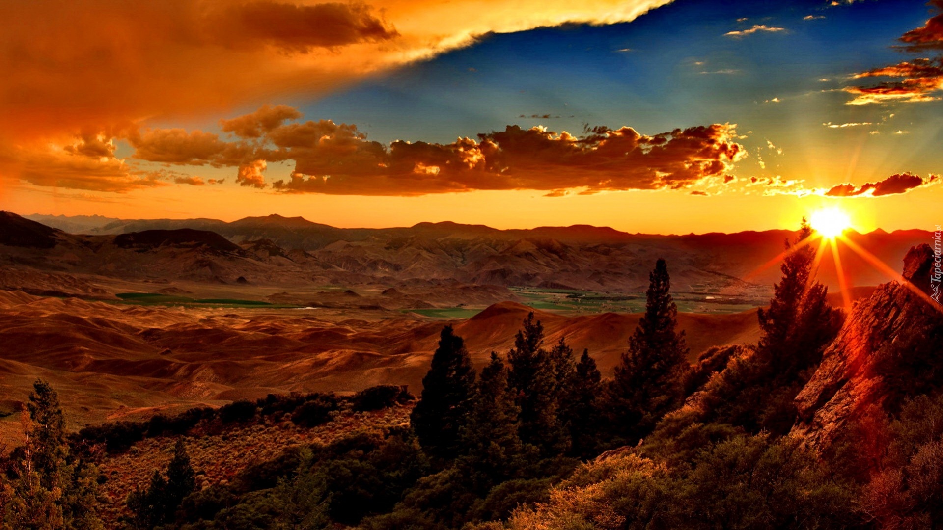 Edytor tapety: Łąki, Promienie, Słońca, Kolorowe, Niebo