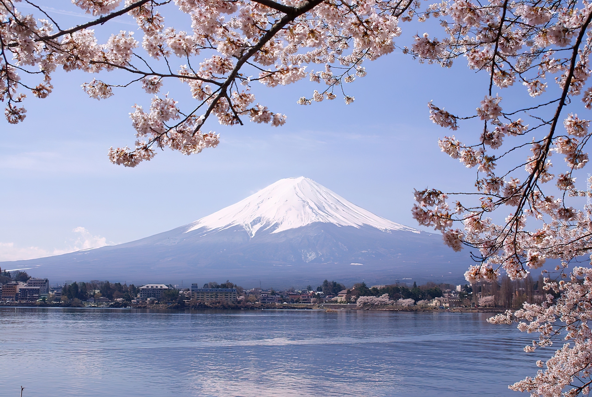 Edytor tapety: Jezioro, Kwitnące, Gałązki, Góra, Fuji, Japonia