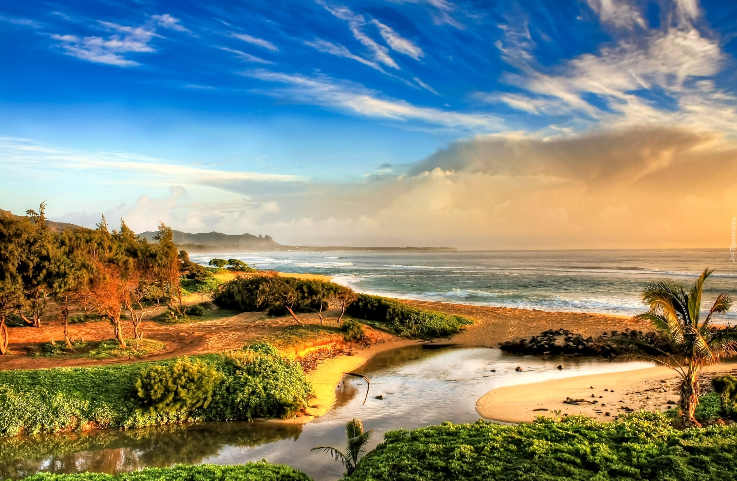 Edytor tapety: Morze, Drzewa, Niebo, Chmury, Dopływ