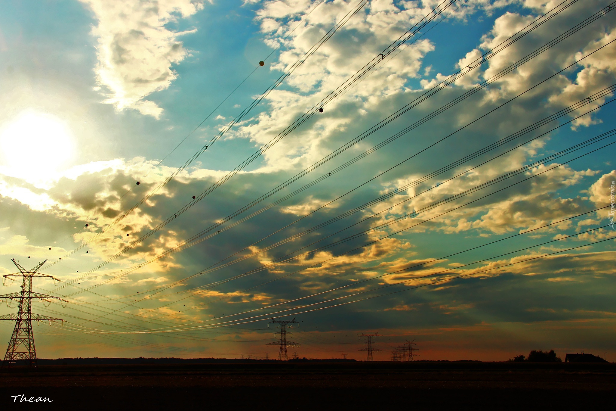 Edytor tapety: Linie, Wysokiego, Napięcia, Niebo, Chmury, Promienie