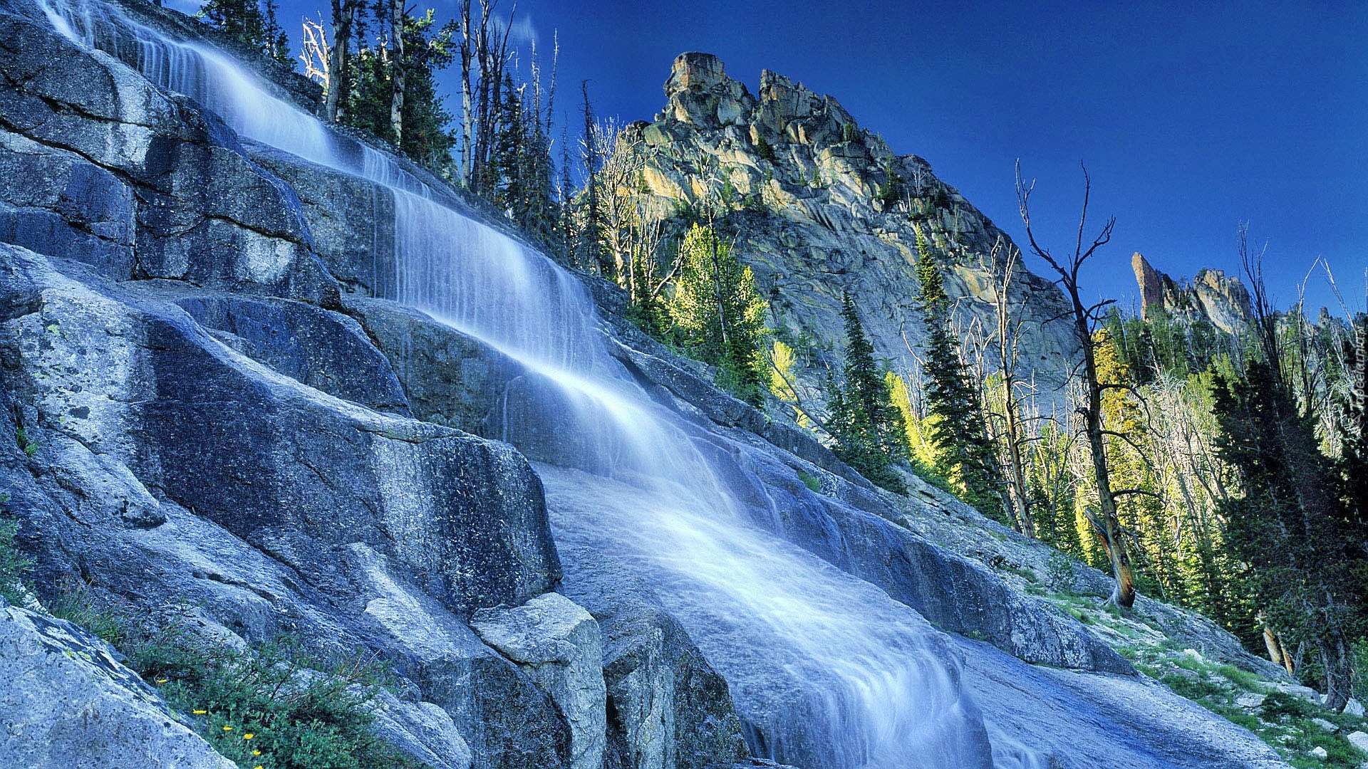 Edytor tapety: Góry, Wodospad, Drzewa, Niebo