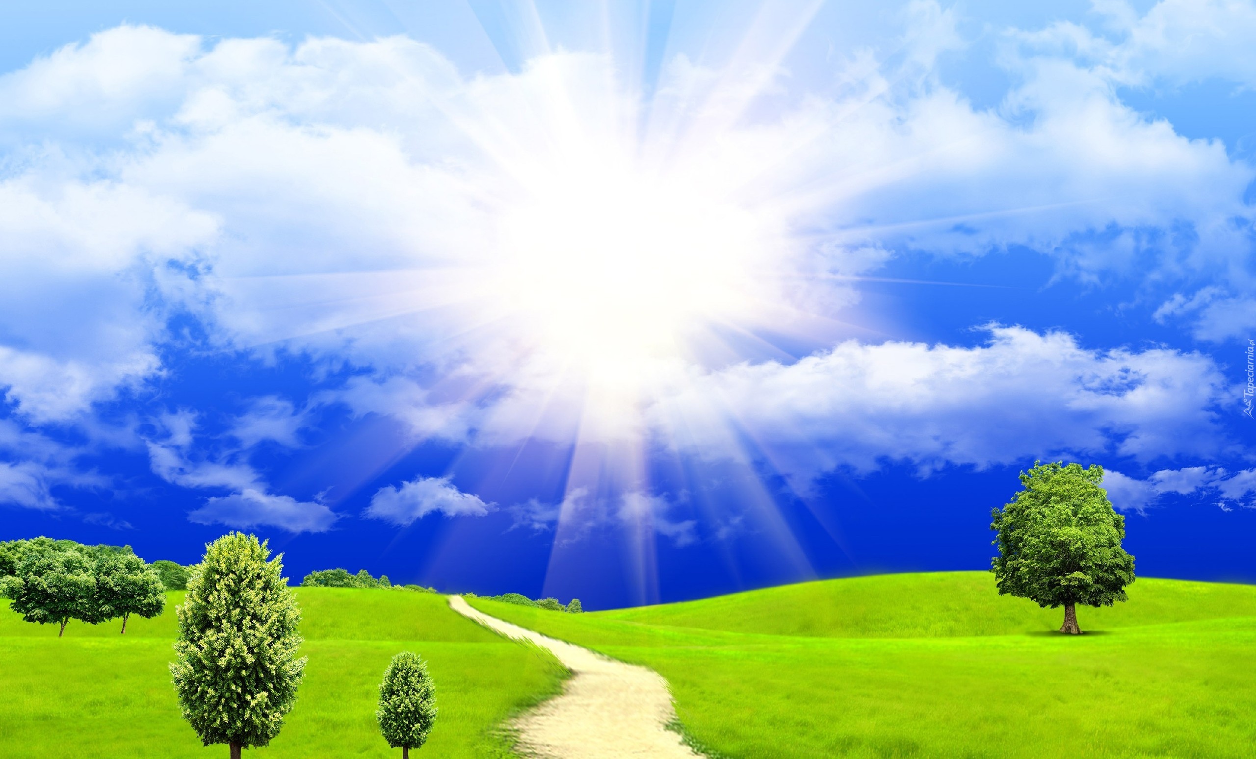 Edytor tapety: Słońce, Chmury, Łąka, Drzewa, Droga