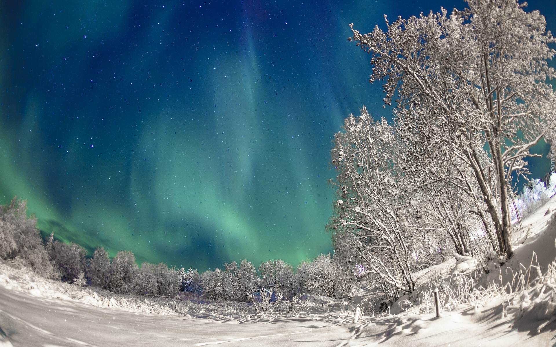Edytor tapety: Zorza, Polarana, Drzewa, Zima