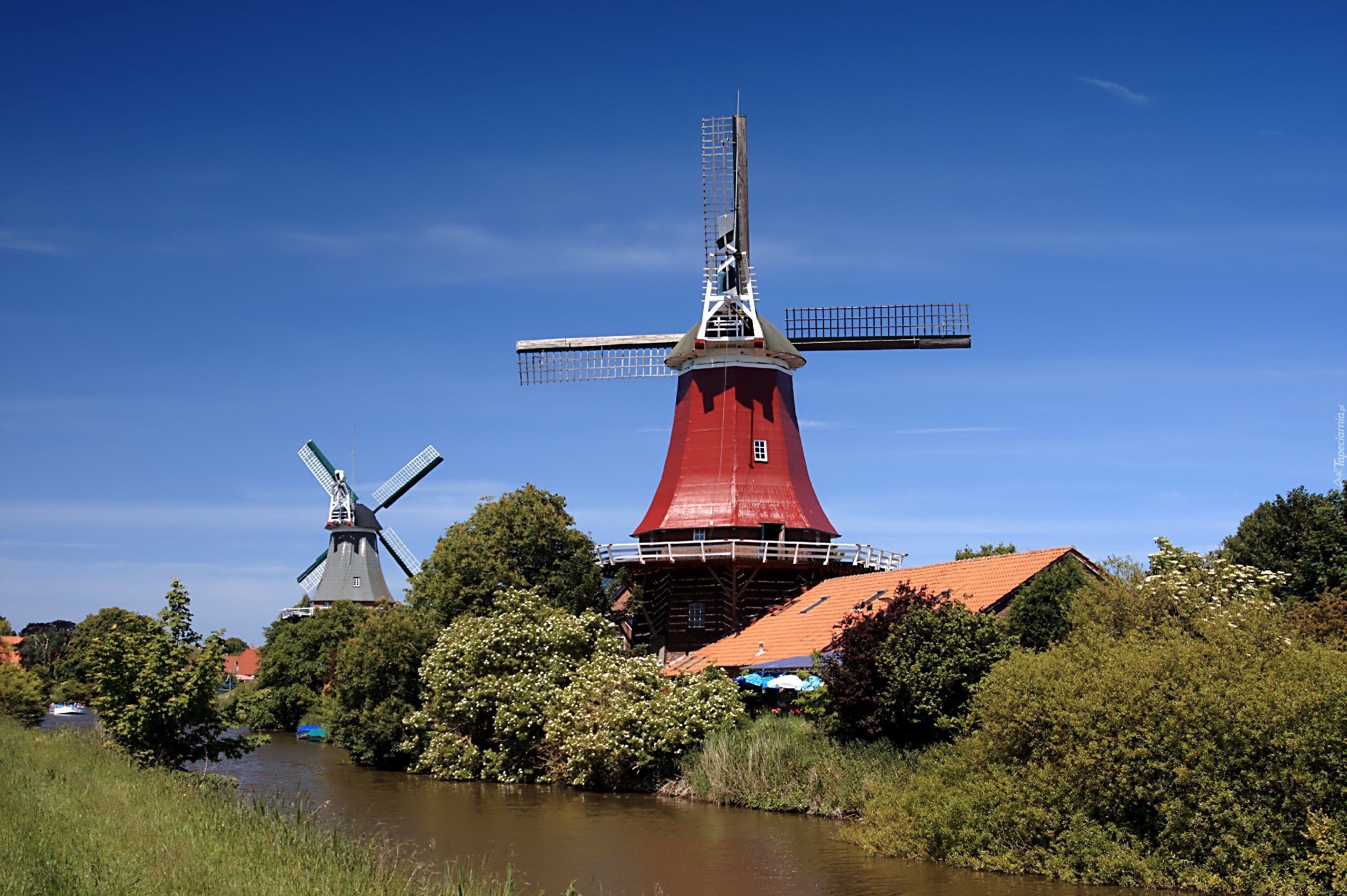Edytor tapety: Wiatraki, Rzeka, Drzewa