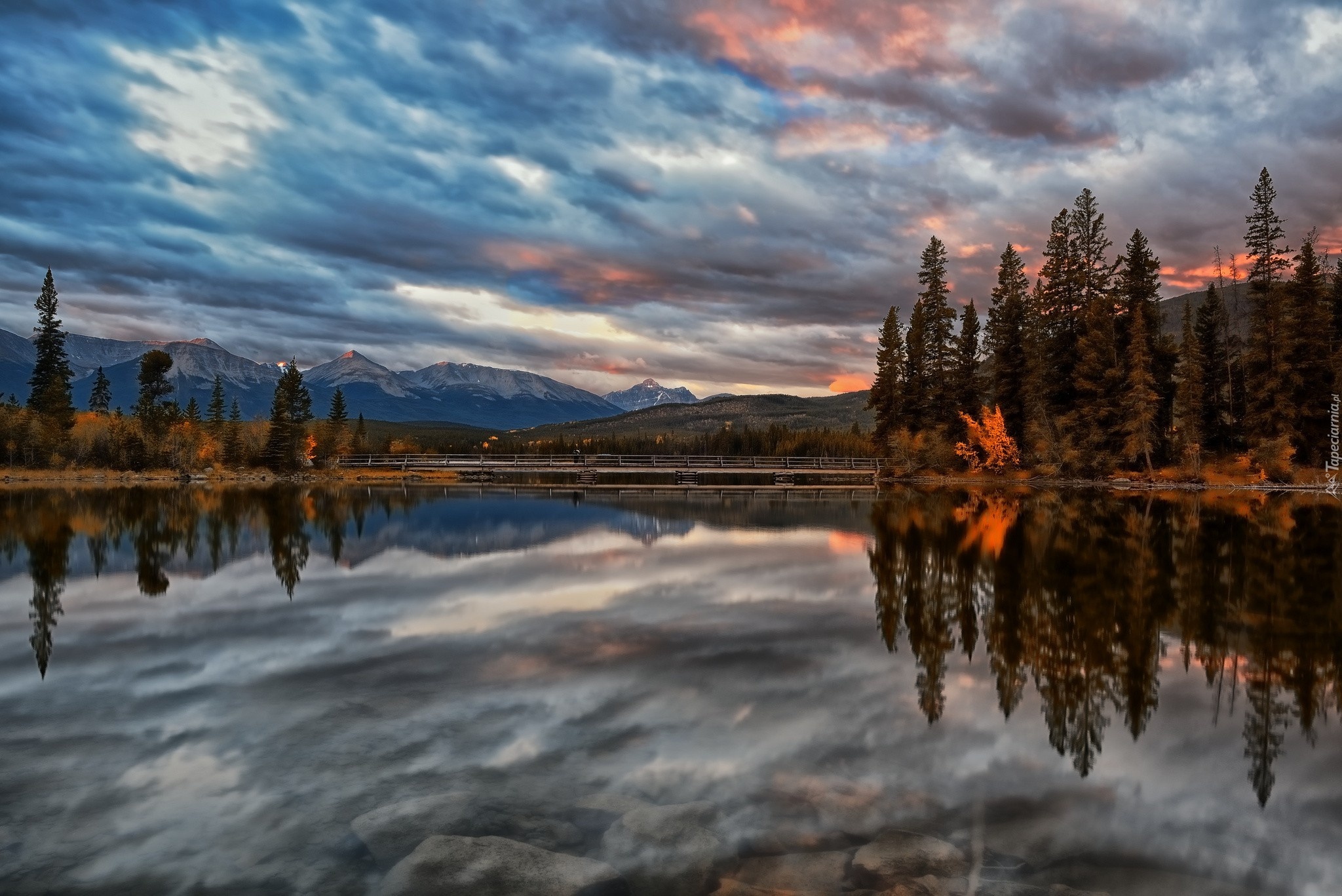 Edytor tapety: Jezioro, Drzewa, Góry, Zachmurzone, Niebo