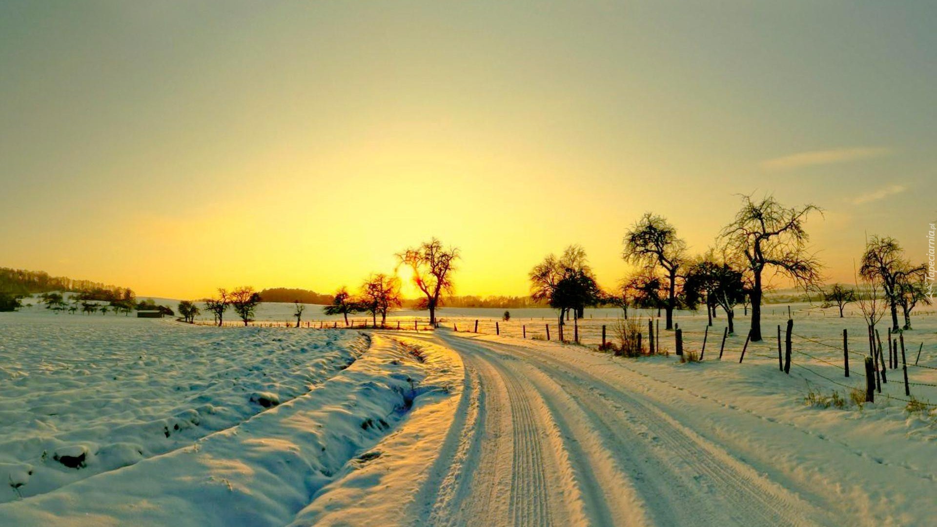 Edytor tapety: Śnieg, Droga, Pola, Zachód, Słońca