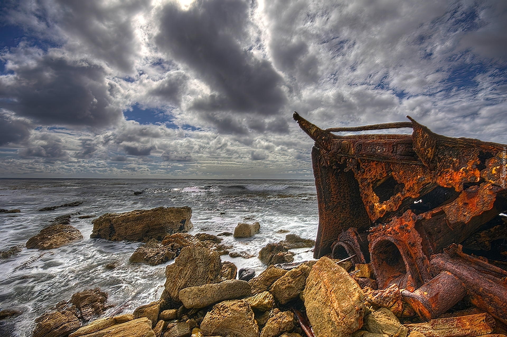 Edytor tapety: Morze, Skały, Chmury, Wrak, Statku