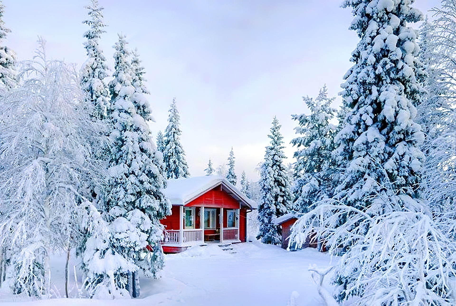 Edytor tapety: Czerwony, Domek, Zima, Ośnieżone, Drzewa