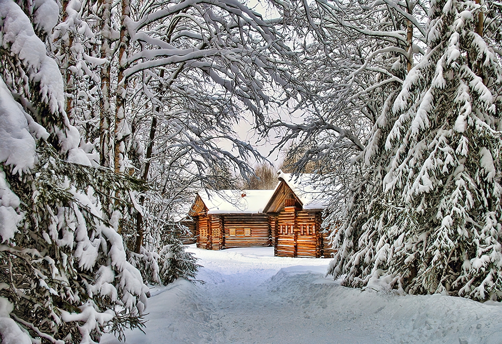 Edytor tapety: Domki, Ośnieżone, Choinki, Zima