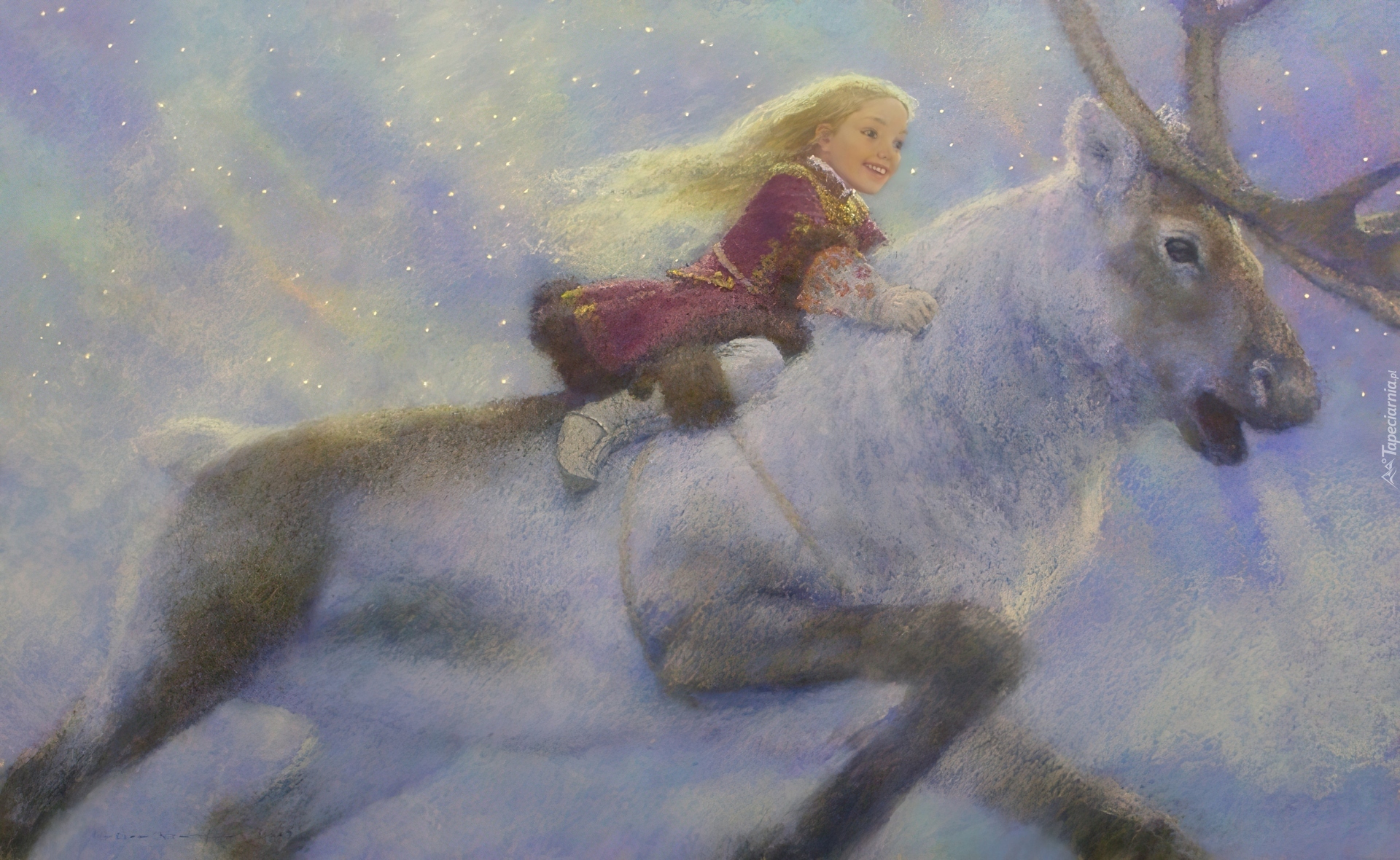 Edytor tapety: Christian Brimingham, Malarstwo, Dziewczynka, Renifer, Zima