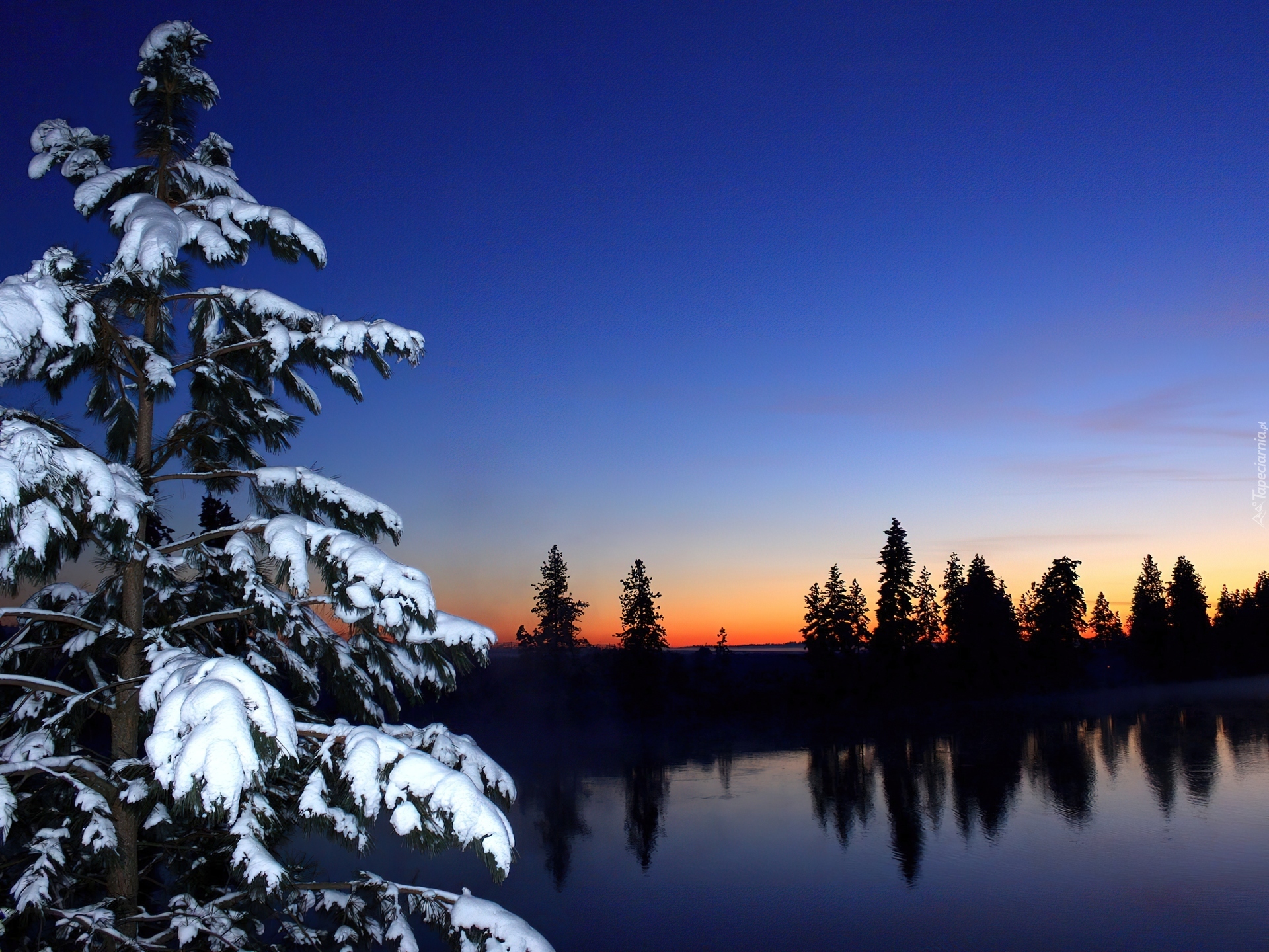 Edytor tapety: Zima, Rzeka, Zachód, Słońca, Świerk