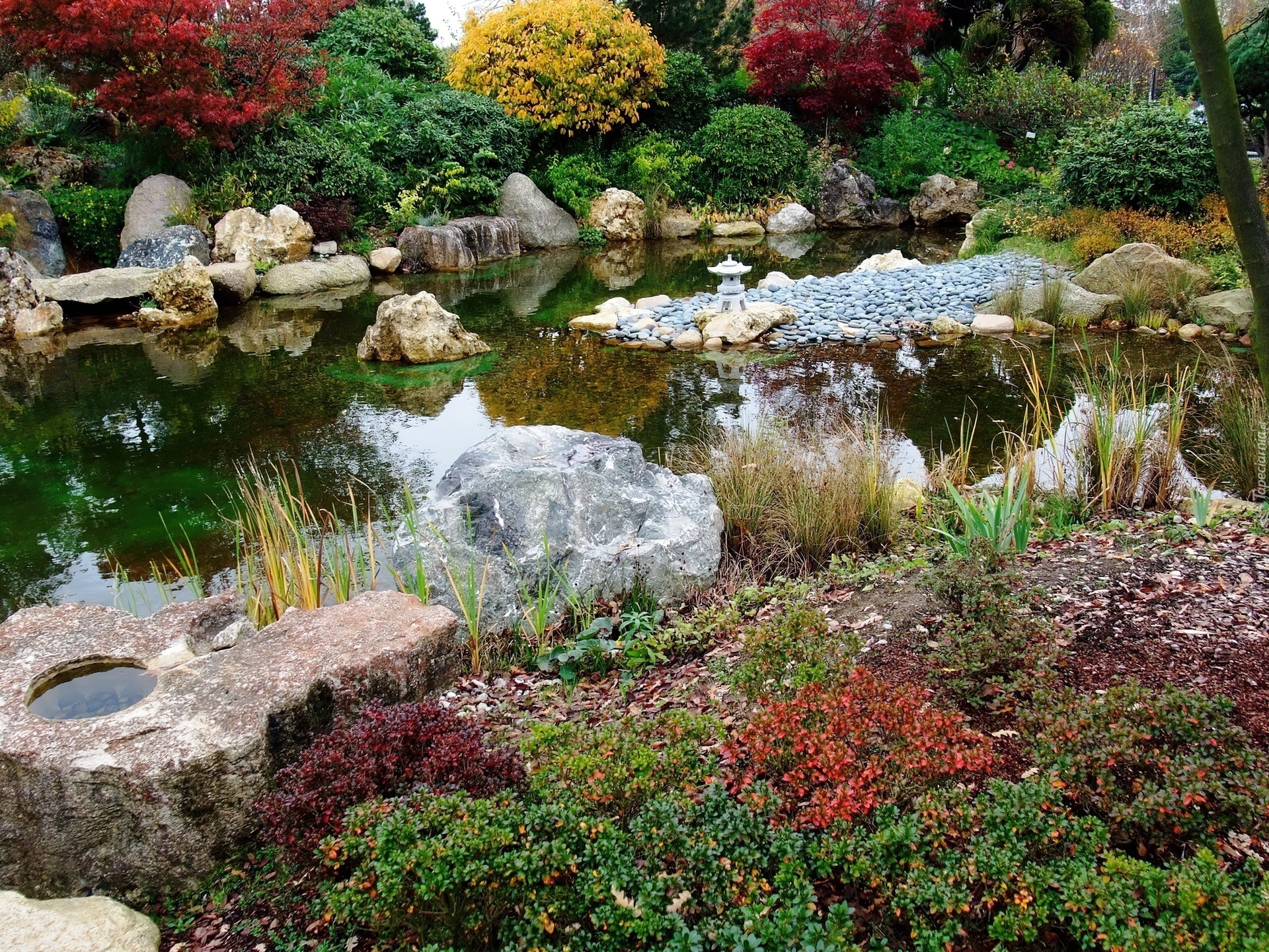 Edytor tapety: Ogród, Kolorowe, Krzewy, Staw, Kamienie