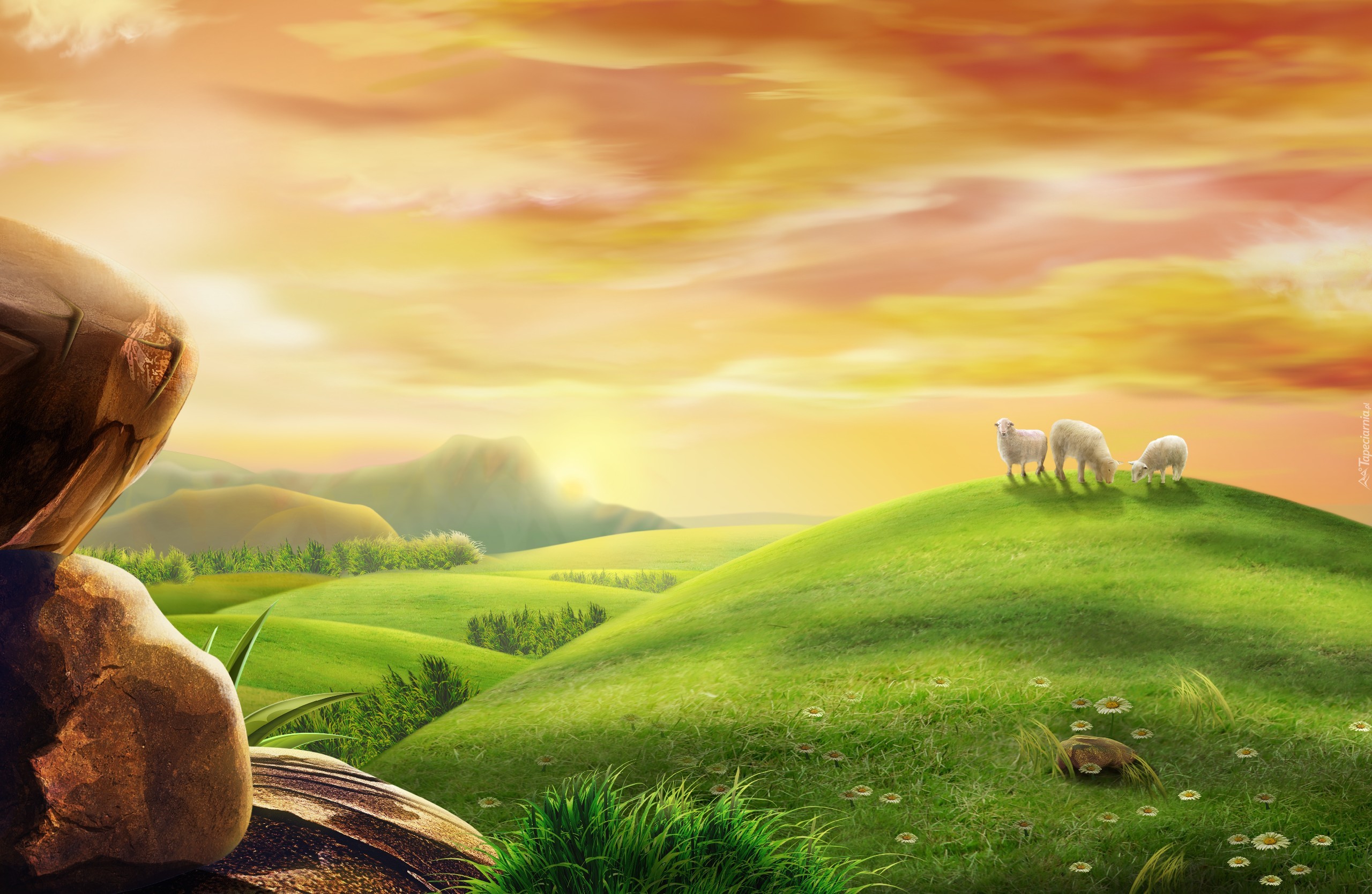 Edytor tapety: Zachód, Słońca, Łąka, Owieczki